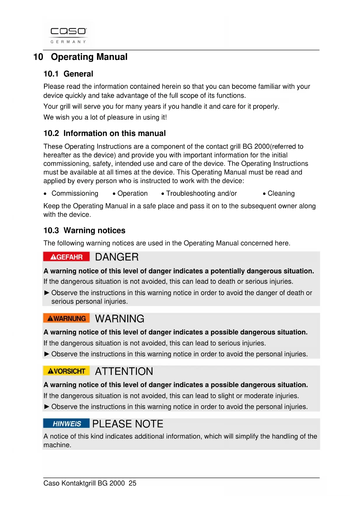 The following warning notices are used in the Operating Manual concerned here. DANGER A warning notice of this level of danger indicates a potentially dangerous situation. If the dangerous situation is not avoided, this can lead to death or serious injuries. ► Observe the instructions in this warning notice in order to avoid the danger of death or serious personal injuries. WARNING A warning notice of this level of danger indicates a possible dangerous situation. If the dangerous situation is not avoided, this can lead to serious injuries. ► Observe the instructions in this warning notice in order to avoid the personal injuries. ATTENTION A warning notice of this level of danger indicates a possible dangerous situation. If the dangerous situation is not avoided, this can lead to slight or moderate injuries. ► Observe the instructions in this warning notice in order to avoid the personal injuries. PLEASE NOTE A notice of this kind indicates additional information, which will simplify the handling of the machine.Caso Kontaktgrill BG 2000 26
