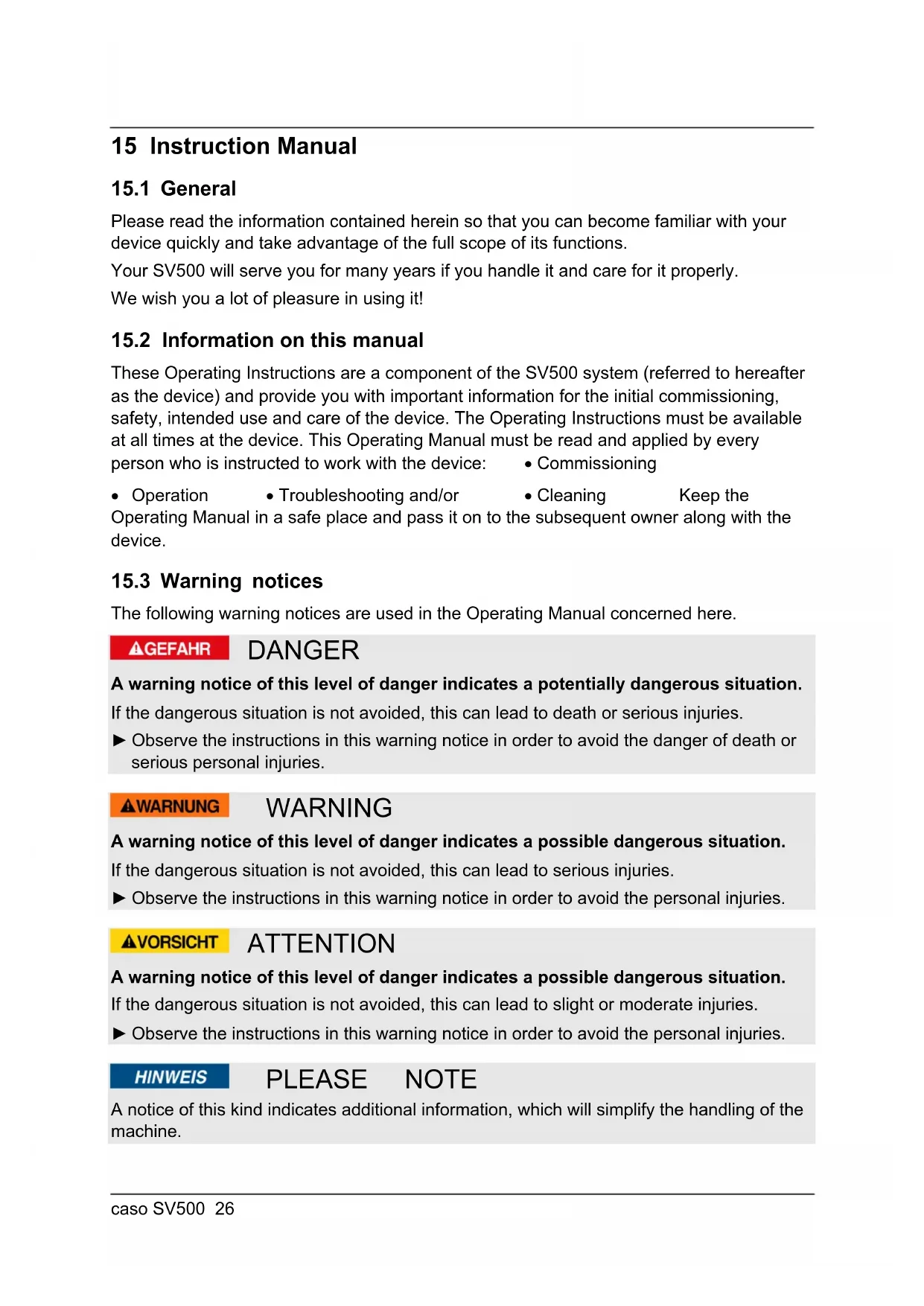 The following warning notices are used in the Operating Manual concerned here. DANGER A warning notice of this level of danger indicates a potentially dangerous situation. If the dangerous situation is not avoided, this can lead to death or serious injuries. ► Observe the instructions in this warning notice in order to avoid the danger of death or serious personal injuries. WARNING A warning notice of this level of danger indicates a possible dangerous situation. If the dangerous situation is not avoided, this can lead to serious injuries. ► Observe the instructions in this warning notice in order to avoid the personal injuries. ATTENTION A warning notice of this level of danger indicates a possible dangerous situation. If the dangerous situation is not avoided, this can lead to slight or moderate injuries. ► Observe the instructions in this warning notice in order to avoid the personal injuries. PLEASE NOTE A notice of this kind indicates additional information, which will simplify the handling of the machine.caso SV500 27