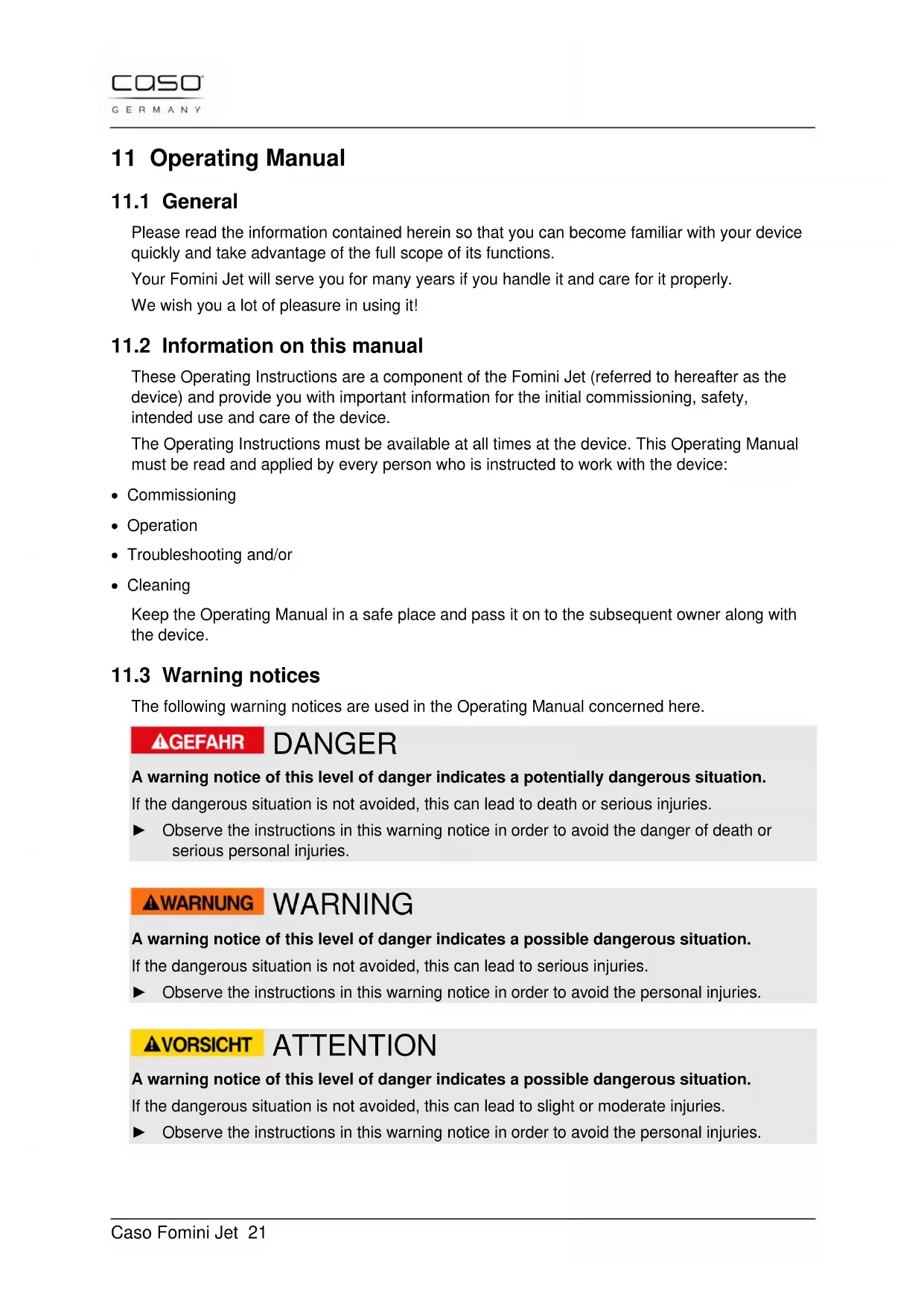 The following warning notices are used in the Operating Manual concerned here. DANGER A warning notice of this level of danger indicates a potentially dangerous situation. If the dangerous situation is not avoided, this can lead to death or serious injuries. ► Observe the instructions in this warning notice in order to avoid the danger of death or serious personal injuries. WARNING A warning notice of this level of danger indicates a possible dangerous situation. If the dangerous situation is not avoided, this can lead to serious injuries. ► Observe the instructions in this warning notice in order to avoid the personal injuries. ATTENTION A warning notice of this level of danger indicates a possible dangerous situation. If the dangerous situation is not avoided, this can lead to slight or moderate injuries. ► Observe the instructions in this warning notice in order to avoid the personal injuries.Caso Fomini Jet 22 PLEASE NOTE A notice of this kind indicates additional information, which will simplify the handling of the machine.