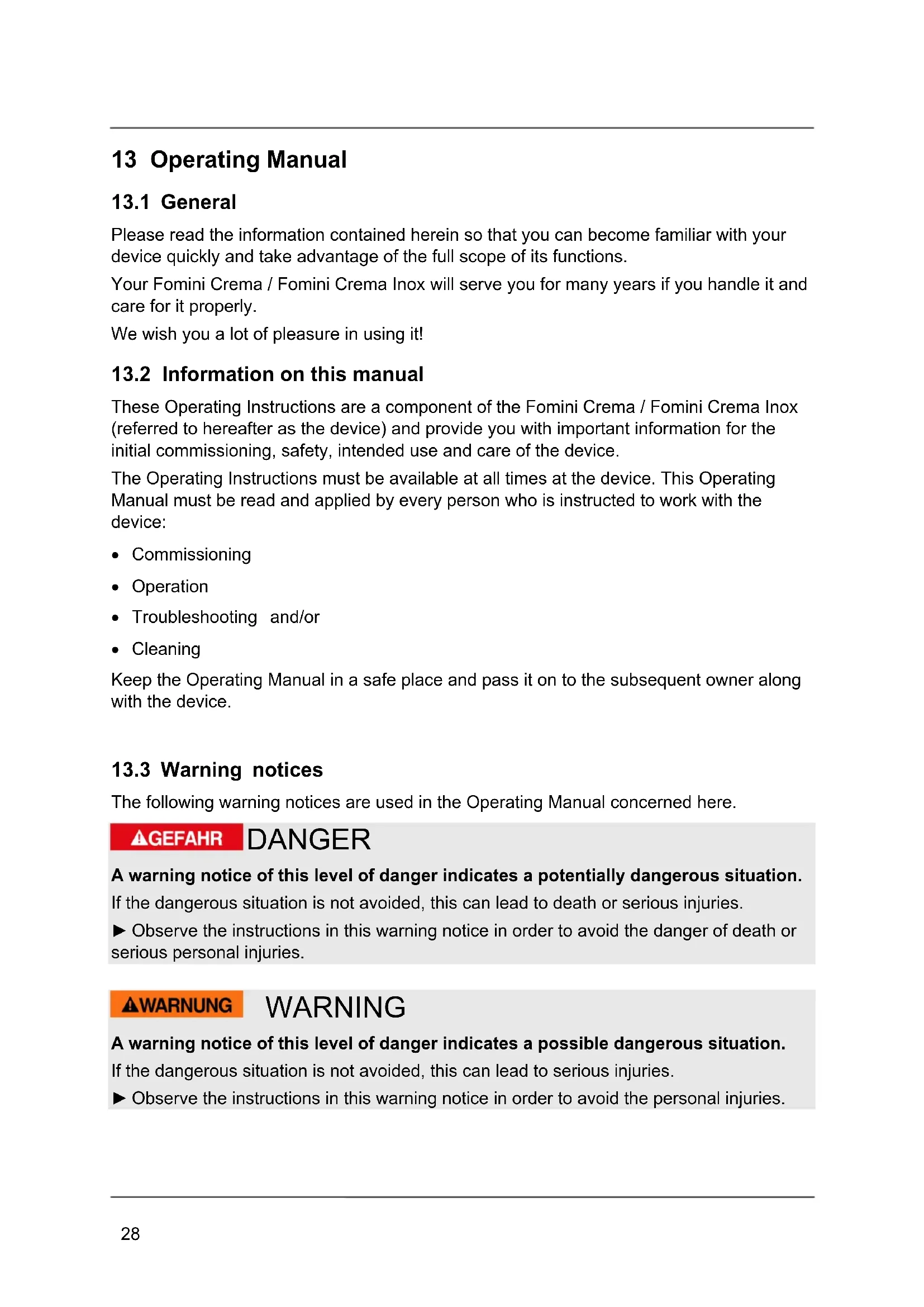These Operating Instructions are a component of the Fomini Crema / Fomini Crema Inox (referred to hereafter as the device) and provide you with important information for the initial commissioning, safety, intended use and care of the device.