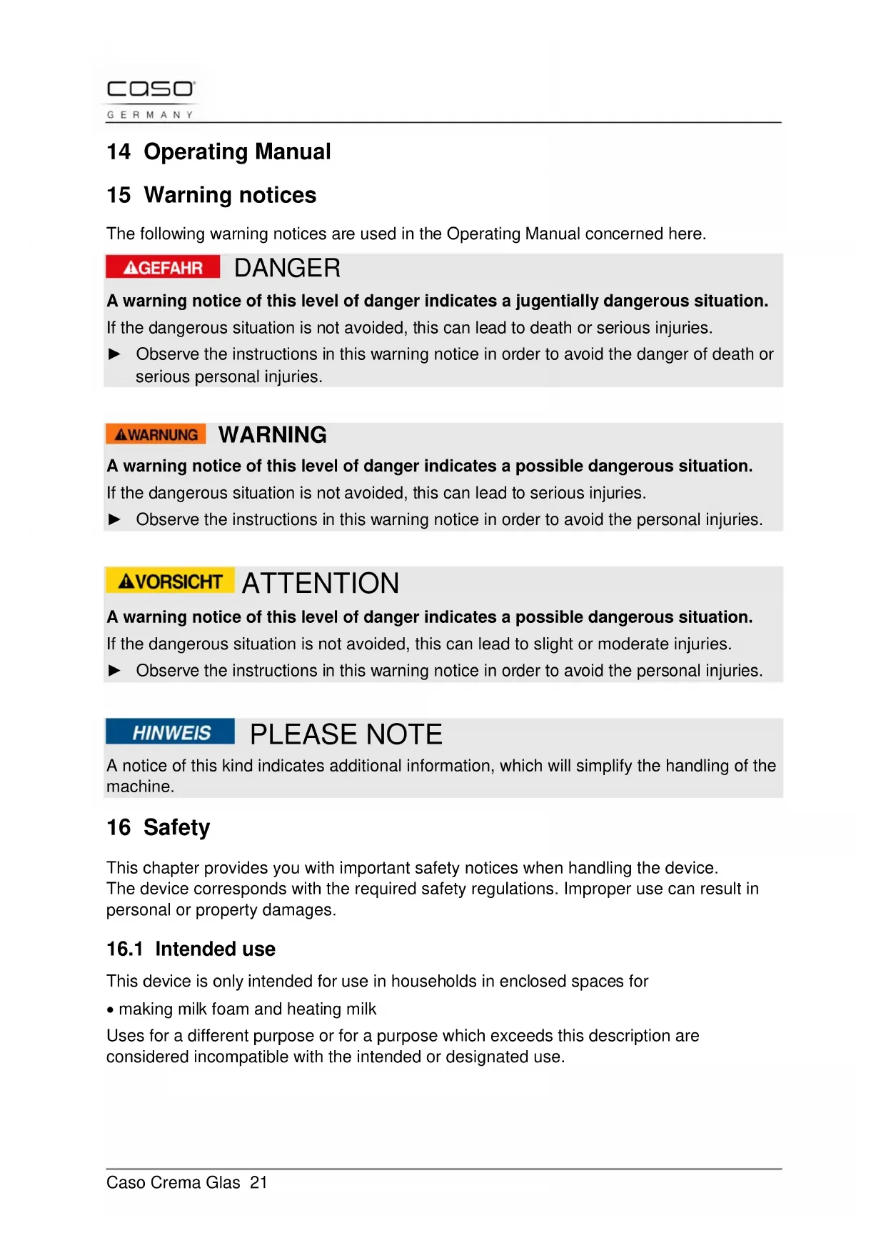 - making milk foam and heating milk Uses for a different purpose or for a purpose which exceeds this description are considered incompatible with the intended or designated use.Caso Crema Glas 22 WARNING Danger due to unintended use! Dangers can emanate from the device if it is used for an unintended use and/or a different kind of use. ► Use the device exclusively for its intended use. ► Observe the procedural methods described in this Operating Manual. Claims of all kinds due to damages resulting from unintended uses are excluded. The User bears the sole risk.