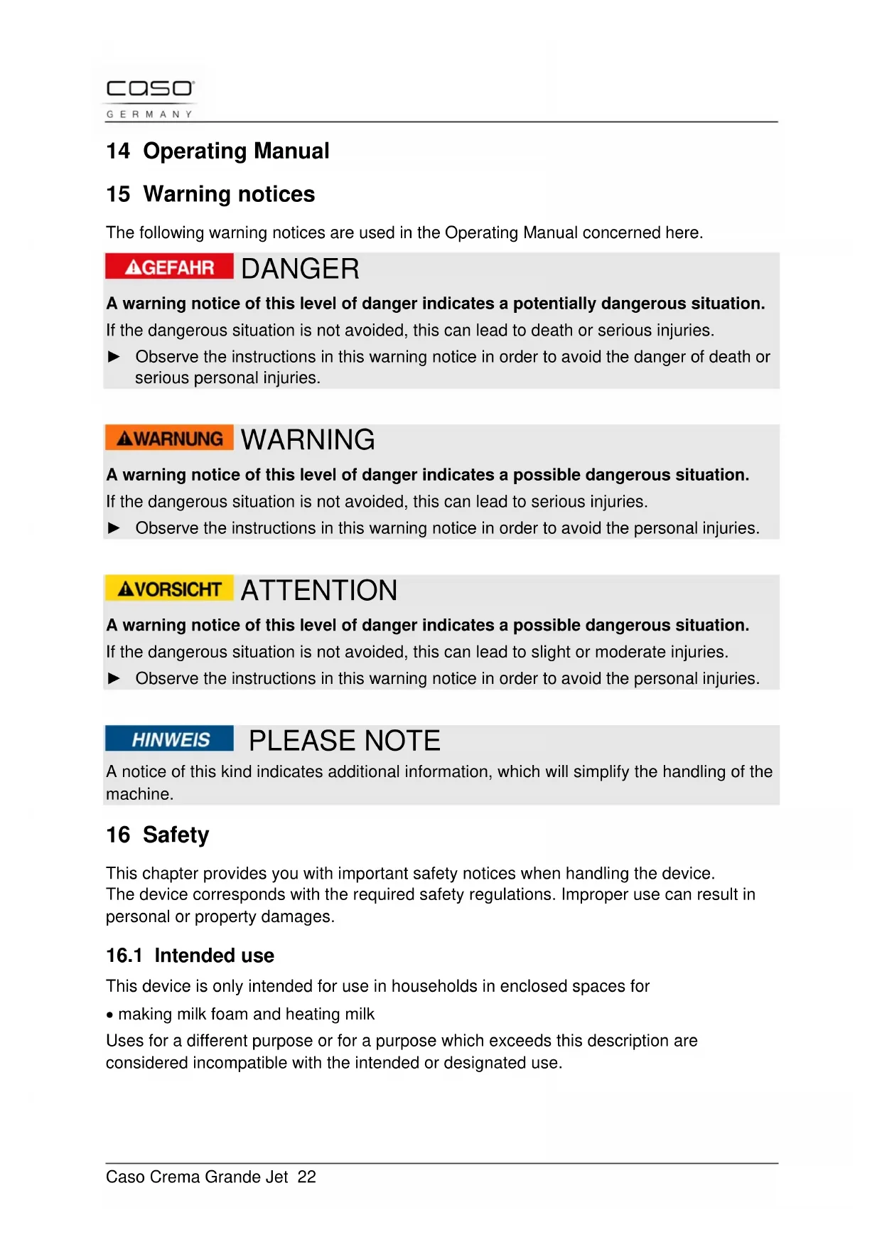 Item No.:1658Caso Crema Grande Jet 22 14 Operating Manual 15 Warning notices The following warning notices are used in the Operating Manual concerned here. DANGER A warning notice of this level of danger indicates a potentially dangerous situation. If the dangerous situation is not avoided, this can lead to death or serious injuries. ► Observe the instructions in this warning notice in order to avoid the danger of death or serious personal injuries. WARNING A warning notice of this level of danger indicates a possible dangerous situation. If the dangerous situation is not avoided, this can lead to serious injuries. ► Observe the instructions in this warning notice in order to avoid the personal injuries. ATTENTION A warning notice of this level of danger indicates a possible dangerous situation. If the dangerous situation is not avoided, this can lead to slight or moderate injuries. ► Observe the instructions in this warning notice in order to avoid the personal injuries. PLEASE NOTE A notice of this kind indicates additional information, which will simplify the handling of the machine. 16 Safety This chapter provides you with important safety notices when handling the device. The device corresponds with the required safety regulations. Improper use can result in personal or property damages.