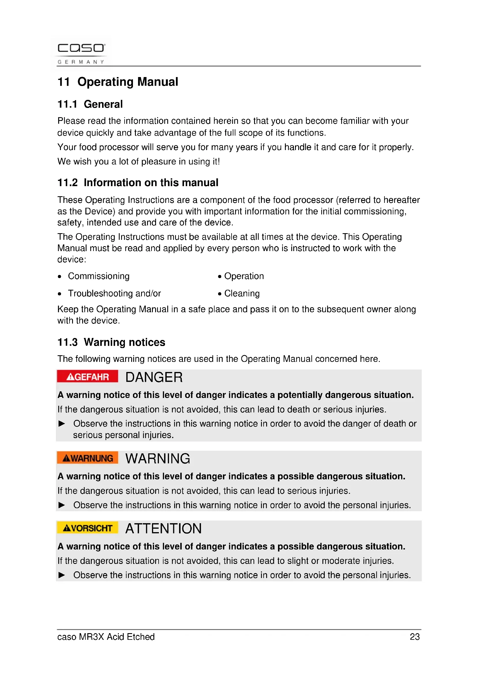 The following warning notices are used in the Operating Manual concerned here. DANGER A warning notice of this level of danger indicates a potentially dangerous situation. If the dangerous situation is not avoided, this can lead to death or serious injuries. ► Observe the instructions in this warning notice in order to avoid the danger of death or serious personal injuries. WARNING A warning notice of this level of danger indicates a possible dangerous situation. If the dangerous situation is not avoided, this can lead to serious injuries. ► Observe the instructions in this warning notice in order to avoid the personal injuries. ATTENTION A warning notice of this level of danger indicates a possible dangerous situation. If the dangerous situation is not avoided, this can lead to slight or moderate injuries. ► Observe the instructions in this warning notice in order to avoid the personal injuries.caso MR3X Acid Etched 24 PLEASE NOTE A notice of this kind indicates additional information, which will simplify the handling of the machine.