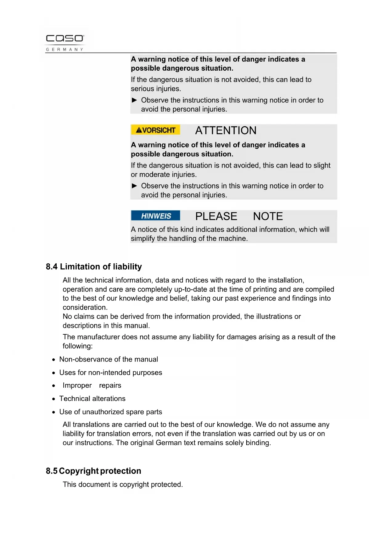 The following warning notices are used in the Operating Manual concerned here. DANGER A warning notice of this level of danger indicates a potentially dangerous situation. If the dangerous situation is not avoided, this can lead to death or serious injuries. ► Observe the instructions in this warning notice in order to avoid the danger of death or serious personal injuries. WARNINGA warning notice of this level of danger indicates a possible dangerous situation. If the dangerous situation is not avoided, this can lead to serious injuries. ► Observe the instructions in this warning notice in order to avoid the personal injuries. ATTENTION A warning notice of this level of danger indicates a possible dangerous situation. If the dangerous situation is not avoided, this can lead to slight or moderate injuries. ► Observe the instructions in this warning notice in order to avoid the personal injuries. PLEASE NOTE A notice of this kind indicates additional information, which will simplify the handling of the machine.