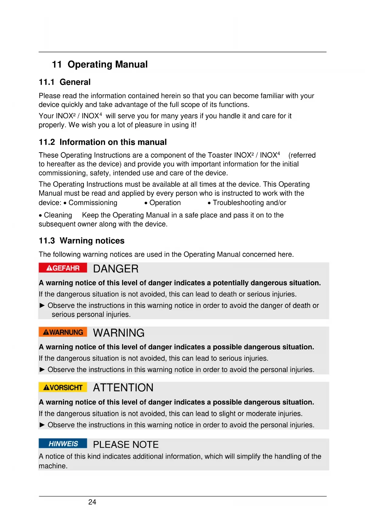 These Operating Instructions are a component of the Toaster INOX ^2 / INOX ^4 (referred to hereafter as the device) and provide you with important information for the initial commissioning, safety, intended use and care of the device.