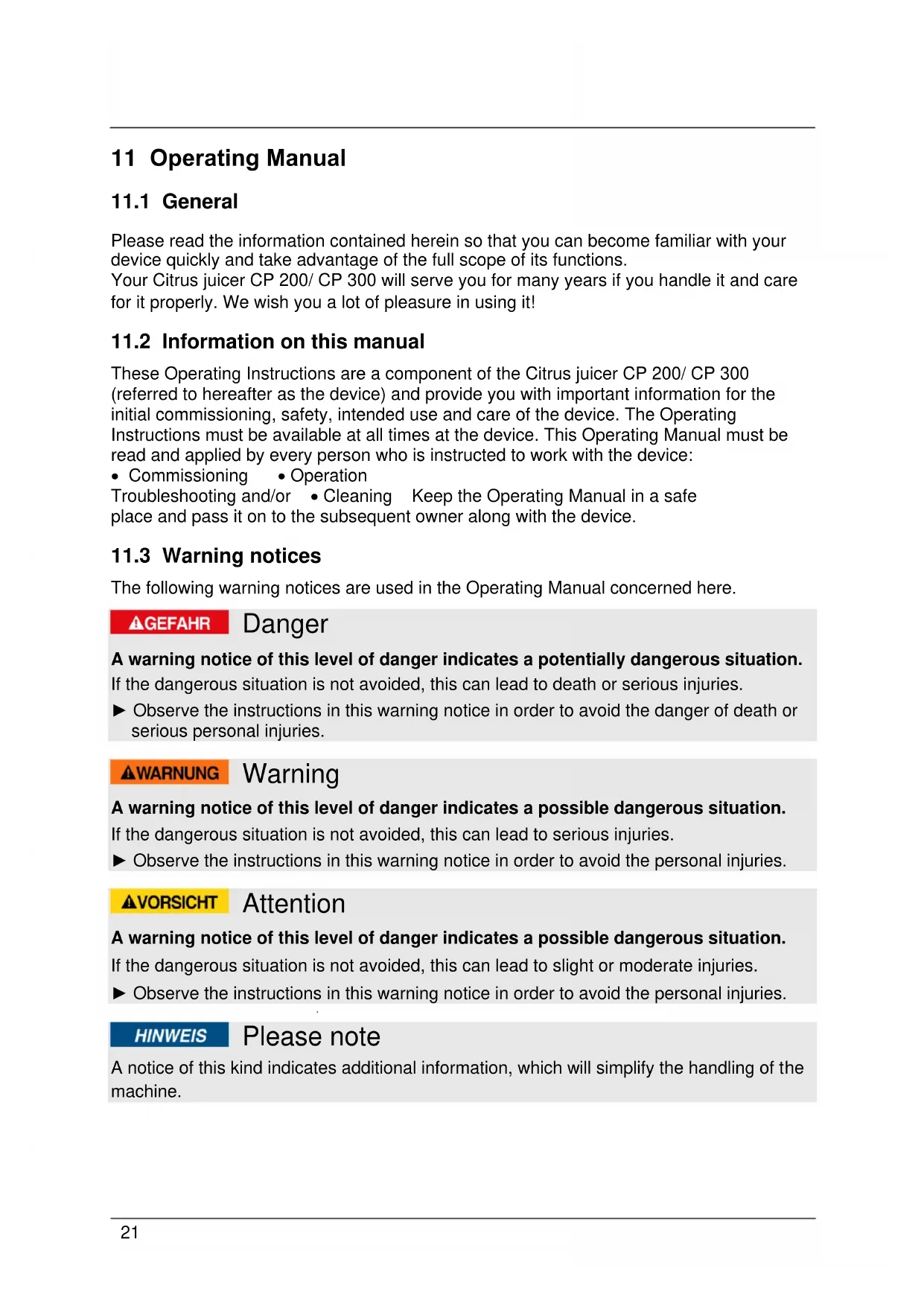 These Operating Instructions are a component of the Citrus juicer CP 200/ CP 300 (referred to hereafter as the device) and provide you with important information for the initial commissioning, safety, intended use and care of the device. The Operating Instructions must be available at all times at the device. This Operating Manual must be read and applied by every person who is instructed to work with the device: