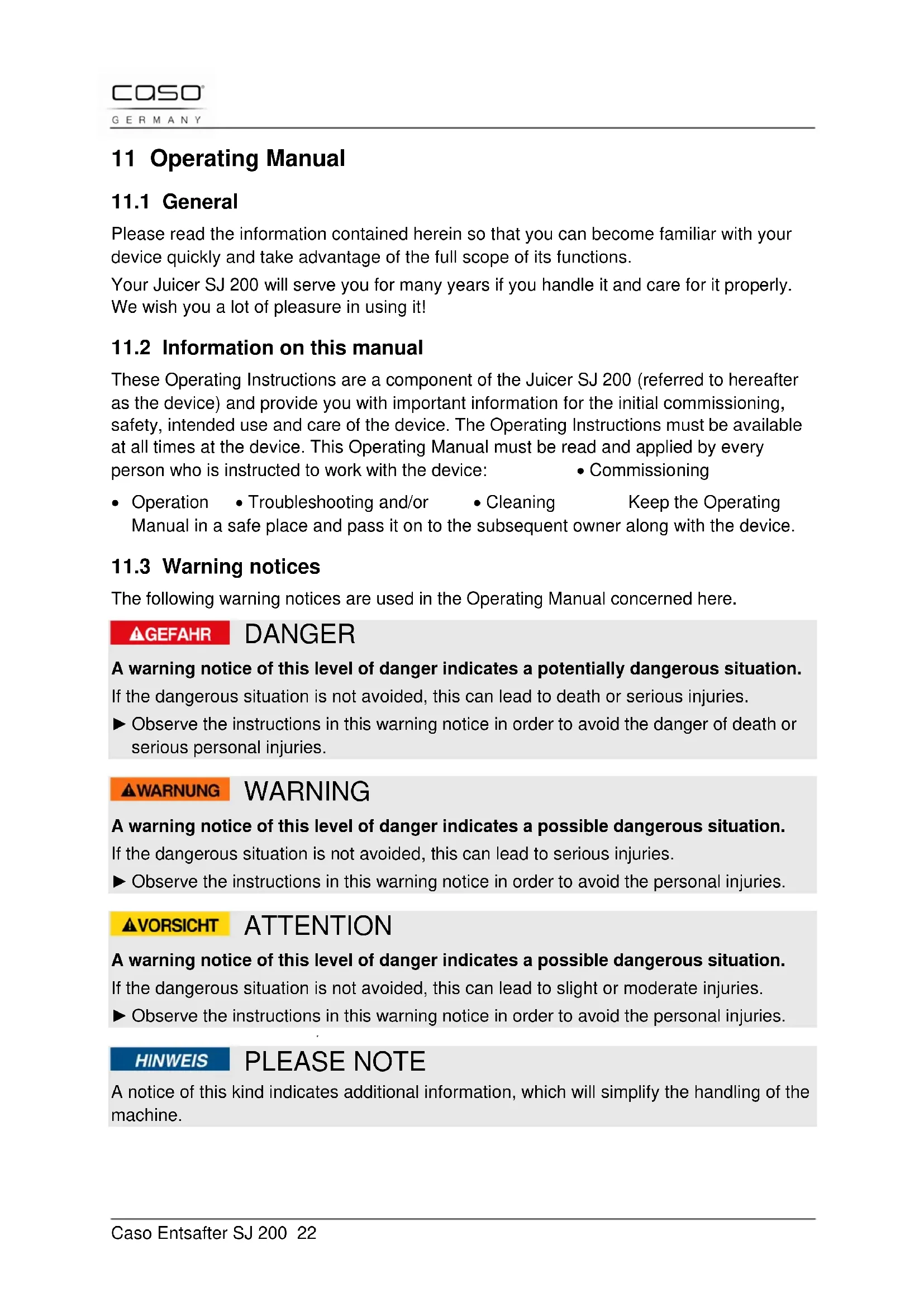 - Extracting juice from vegetables and/or fruit Uses for a different purpose or for a purpose which exceeds this description are considered incompatible with the intended or designated use. Warning Danger due to unintended use! Dangers can emanate from the device if it is used for an unintended use and/or a different kind of use. ► Use the device exclusively for its intended use. ► Observe the procedural methods described in this Operating Manual. Claims of all kinds due to damages resulting from unintended uses are excluded. The User bears the sole risk.Caso Entsafter SJ 200 24