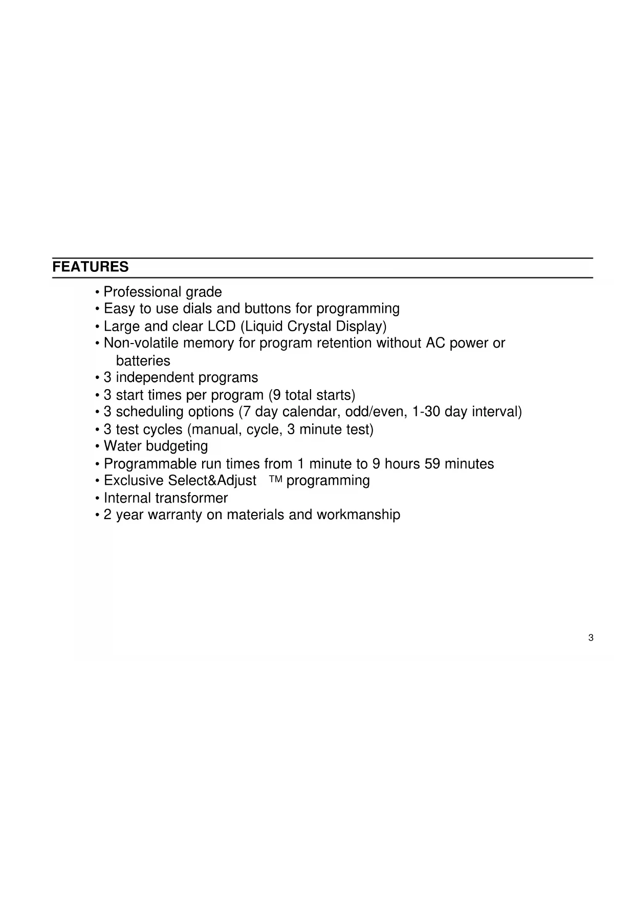 TO PROGRAM PLACE THE MODE DIAL NAME PROGRAM ADDITION PROGRAM ON/OFF LARGE HUAL POSITION SELECT +1 ADJUST +2 AMTIME START TIME NUTS START DAY ORDER SEMICOLE THE PROGRAM DIAL can be in A. B. AND BY OF RE-NOMINALISATE. RETURN NODE DIAL, TO ROW POSITION WHEN PROGRAMSING IS COMPLETE TO RUN PROGRAMME. NOTE: MANUAL, CHOLE and PROCESSED ORDER BE SHOWN IN THE MAIN STICK - 100% RUN & ISSIP TO RUN TEST PLACE THE MODE BALAN IN THE SE ADDITION PROGRAM ON/OFF LARGE HUAL POSITION SELECT +1 ADJUST +2 BALANCY RUN TIME NOT PROCOMPARABLE STORAGE NOT PROCOMPARABLE LEAVE MODE DIAL: IN 'ON' POSITION WHEN COMPLETE PROGRAMM WELL RUN NE SCHEDULED: NOTE: Pending SELECT OR WHILE THE MANUAL, then is coming will. ADDITIONLY INVOCED THE ACTIVE ZONE AND END TO END ON THE NEW NEEOME ZONE 6:34PM Su IR T W Th F S Select Adjust AUTO + Mode Program A B C OFF Program NEISON SmartZone EZTHANK YOU for purchasing the SmartZone™ EZ electronic irrigation controller. You'll soon discover why we've dubbed it the "EZ". We are confident it will be the easiest and most reliable controller you will ever use. It's so "EZ", you'll probably be able to install and program this feature-packed controller without instructions. However, before installing and programming the controller, we recommend you read these instructions carefully to take full advantage of all the SmartZone™ EZ has to offer.