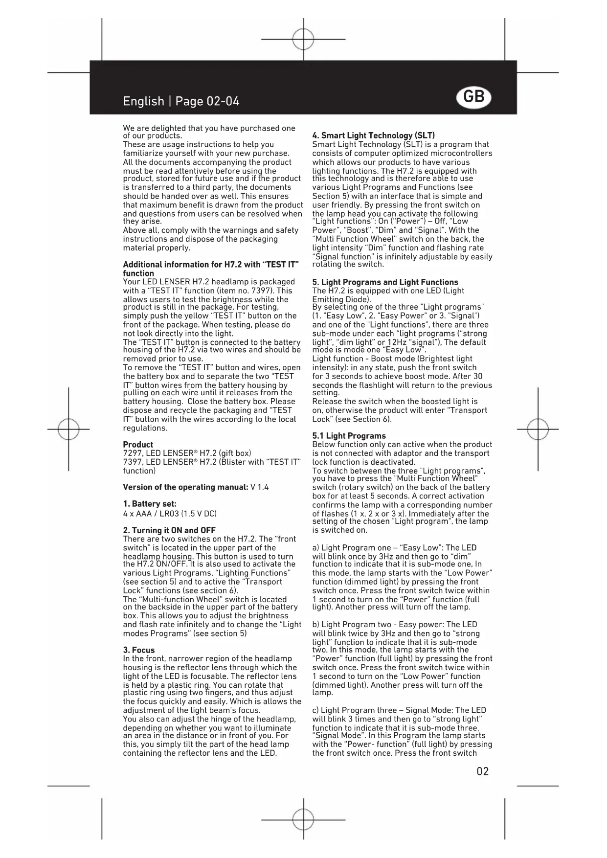 Smart Light Technology (SLT) is a program that consists of computer optimized microcontrollers which allows our products to have various lighting functions. The H7.2 is equipped with this technology and is therefore able to use various Light Programs and Functions (see Section 5) with an interface that is simple and user friendly. By pressing the front switch on the lamp head you can activate the following "Light functions": On ("Power") - Off, "Low Power", "Boost", "Dim" and "Signal". With the "Multi Function Wheel" switch on the back, the light intensity "Dim" function and flashing rate "Signal function" is infinitely adjustable by easily rotating the switch.
