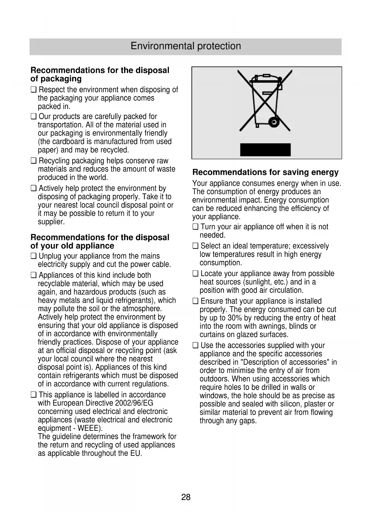 Environmental protection Recommendations for the disposal of packaging ❏ Respect the environment when disposing of the packaging your appliance comes packed in. ❏ Our products are carefully packed for transportation. All of the material used in our packaging is environmentally friendly (the cardboard is manufactured from used paper) and may be recycled. ❏ Recycling packaging helps conserve raw materials and reduces the amount of waste produced in the world. ❏ Actively help protect the environment by disposing of packaging properly. Take it to your nearest local council disposal point or it may be possible to return it to your supplier. Recommendations for the disposal of your old appliance ❏ Unplug your appliance from the mains electricity supply and cut the power cable. ❏ Appliances of this kind include both recyclable material, which may be used again, and hazardous products (such as heavy metals and liquid refrigerants), which may pollute the soil or the atmosphere. Actively help protect the environment by ensuring that your old appliance is disposed of in accordance with environmentally friendly practices. Dispose of your appliance at an official disposal or recycling point (ask your local council where the nearest disposal point is). Appliances of this kind contain refrigerants which must be disposed of in accordance with current regulations. ❏ This appliance is labelled in accordance with European Directive 2002/96/EG concerning used electrical and electronic appliances (waste electrical and electronic equipment - WEEE). The guideline determines the framework for the return and recycling of used appliances as applicable throughout the EU. Recommendations for saving energy Your appliance consumes energy when in use. The consumption of energy produces an environmental impact. Energy consumption can be reduced enhancing the efficiency of your appliance. ❏ Turn your air appliance off when it is not needed. ❏ Select an ideal temperature; excessively low temperatures result in high energy consumption. ❏ Locate your appliance away from possible heat sources (sunlight, etc.) and in a position with good air circulation. ❏ Ensure that your appliance is installed properly. The energy consumed can be cut by up to 30% by reducing the entry of heat into the room with awnings, blinds or curtains on glazed surfaces. ❏ Use the accessories supplied with your appliance and the specific accessories described in "Description of accessories" in order to minimise the entry of air from outdoors. When using accessories which require holes to be drilled in walls or windows, the hole should be as precise as possible and sealed with silicon, plaster or similar material to prevent air from flowing through any gaps.2929 Environmental protection Important Information Before connecting your appliance ❏ Read the instructions book before using the appliance for the first time. It contains important information concerning not only how to use the appliance, but also maintenance and personal safety. ❏ Keep this instructions book. It may be needed by another user at a later date. ❏ Do not use the appliance when damaged. ❏ Your appliance should be assembled and connected to the mains electricity supply in accordance with the assembly instructions and current regulations. You may lose your warranty if you fail to observe these instructions. ❏ Our appliances are manufactured in accordance with current safety regulations. Only technicians instructed in these matters are authorised to repair them. Your safety is at stake. ❏ It is recommended that you follow the manufacturer’s instructions concerning the air expulsion tube (see "Preparing the appliance before use") in order to prevent efficiency loss and unnecessary energy consumption. ❏ Avoid sharp bends on the air expulsion tube and do not lengthen it more than necessary. ❏ When expelling hot air through sliding windows, install the accessory which prevents hot air entering the room from outdoors and enhances efficiency. ❏ Make sure that the diffusion duct is positioned in such a way that the window can be closed as far as possible in order to prevent air from outdoors entering the room. ❏ Check that the sleeves (collection and diffusion) are correctly joined to the air expulsion tube. See "Ways of releasing air outdoors". ❏ Make sure that the air intakes and outlets are not obstructed. Keep them clean and free of dirt, dust and foreign objects. ❏ Make sure that the filters fitted on your appliance are clean and installed properly (see "Cleaning and Maintenance"). ❏ In the summer, ventilate the building when the air outdoors is at its coolest (early morning, night). ❏ Make sure that the drainage plug is fully inserted. It may have come loose during transportation, Fig. 1. Fig. 130 Your new appliance Description of the appliance Diffusion duct Basic filter Hot air outlet Air intake Air intake Cold air outlet Cold air outlet Front flap Hot-air expulsion tube Cable housing Removable tank Characteristics plate Side fins Handles Air conditioning unit Wheels Double active filter Condensed water drainage pipe plug Air expulsion tube parking hook Water drainage pipe Flow director Fig. 231 Your new appliance Control panel UP key