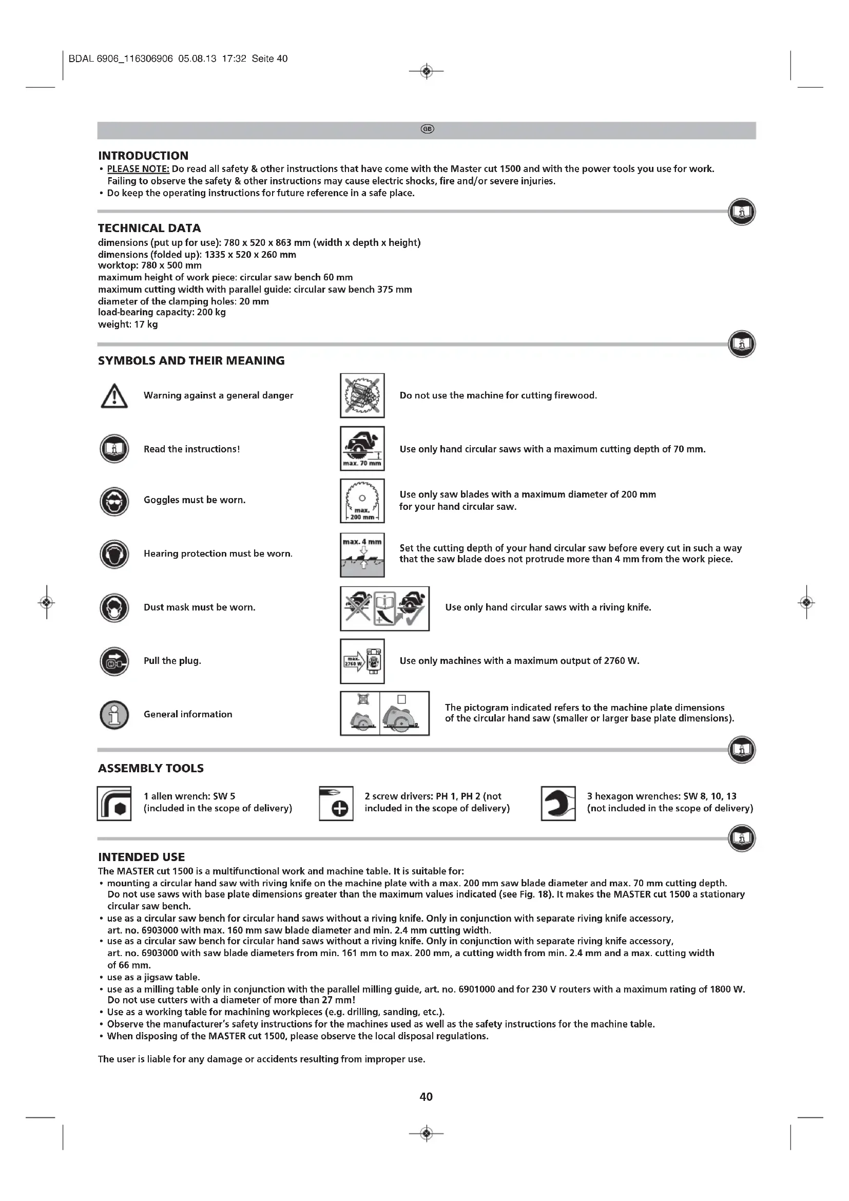 Do not use the machine for cutting firewood. Use only hand circular saws with a maximum cutting depth of 70 mm. Use only saw blades with a maximum diameter of 200 mm for your hand circular saw. Set the cutting depth of your hand circular saw before every cut in such a way that the saw blade does not protrude more than 4 mm from the work piece. The pictogram indicated refers to the machine plate dimensions of the circular hand saw (smaller or larger base plate dimensions). Use only hand circular saws with a riving knife. Warning against a general danger Read the instructions! Goggles must be worn. Hearing protection must be worn. Pull the plug. General information Dust mask must be worn. ASSEMBLY TOOLS 1 allen wrench: SW 5 (included in the scope of delivery) 2 screw drivers: PH 1, PH 2 (not included in the scope of delivery) 3 hexagon wrenches: SW 8, 10, 13 (not included in the scope of delivery) INTENDED USE The MASTER cut 1500 is a multifunctional work and machine table. It is suitable for: