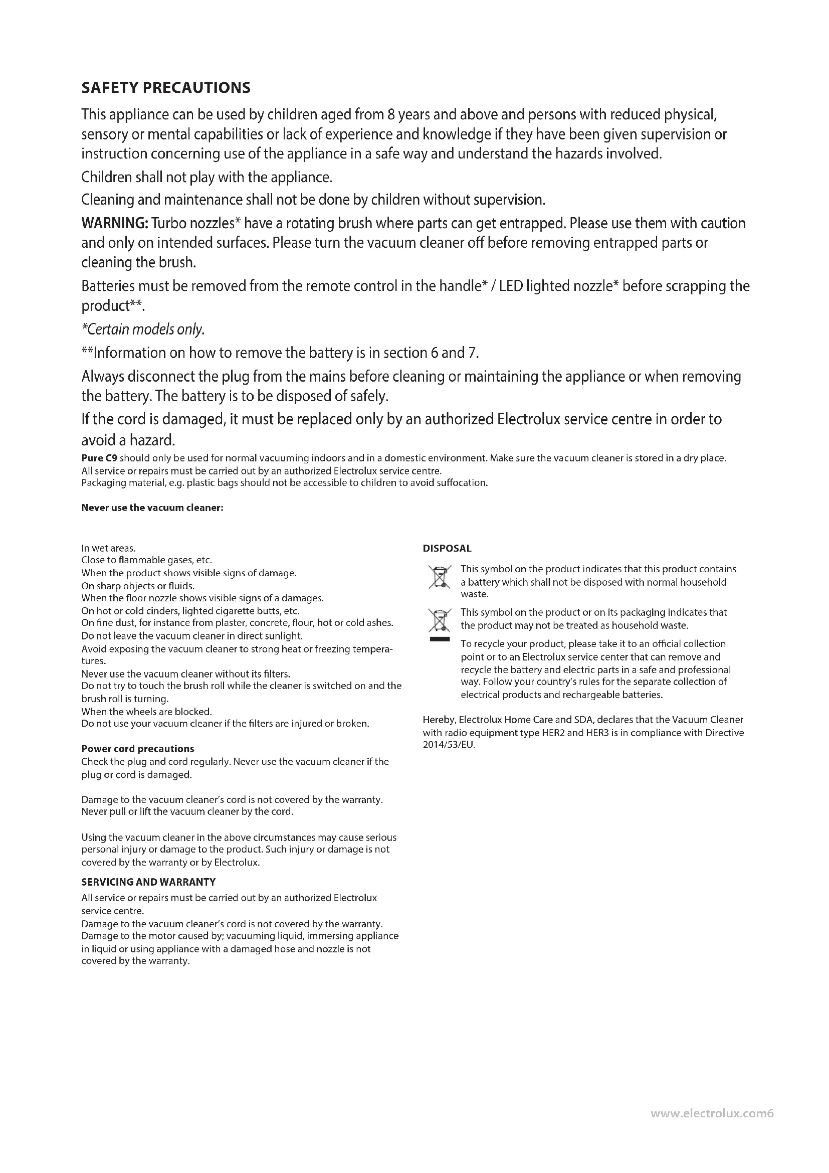 All service or repairs must be carried out by an authorized Electrolux service centre. Damage to the vacuum cleaner’s cord is not covered by the warranty. Damage to the motor caused by; vacuuming liquid, immersing appliance in liquid or using appliance with a damaged hose and nozzle is not covered by the warranty. DISPOSAL This symbol on the product indicates that this product contains a battery which shall not be disposed with normal household waste. This symbol on the product or on its packaging indicates that the product may not be treated as household waste. To recycle your product, please take it to an ocial collection point or to an Electrolux service center that can remove and recycle the battery and electric parts in a safe and professional way. Follow your country’s rules for the separate collection of electrical products and rechargeable batteries. Hereby, Electrolux Home Care and SDA, declares that the Vacuum Cleaner with radio equipment type HER2 and HER3 is in compliance with Directive 2014/53/EU.7www.electrolux.com ENGLISH Thank you for choosing Electrolux Pure C9 vacuum cleaner. Always use original accessories and spare parts to get the best results. This product is designed with the environment in mind. All plastic parts are marked for recycling purposes. BEFORE STARTING