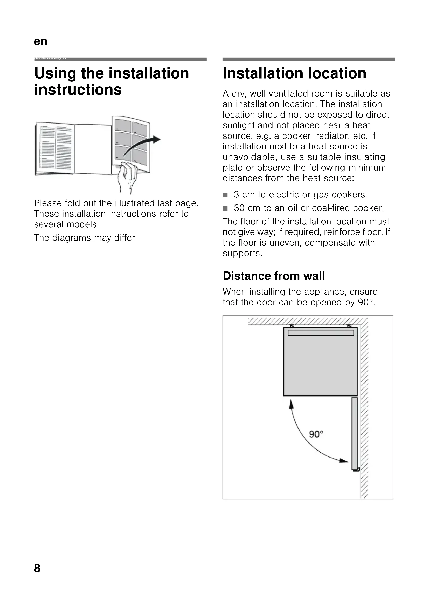 enTable of Content s enInstallation in structions Free-standing appliance Using the installation instructions Please fold out the illustrated last page. These installation instructions refer to several models. The diagrams may differ. Installation location A dry, well ventilated room is suitable as an installation location. The installation location should not be exposed to direct sunlight and not placed near a heat source, e.g. a cooker, radiator, etc. If installation next to a heat source is unavoidable, use a suitable insulating plate or observe the following minimum distances from the heat source: ■ 3 cm to electric or gas cookers. ■ 30 cm to an oil or coal-fired cooker. The floor of the installation location must not give way; if required, reinforce floor. If the floor is uneven, compensate with supports. Distance from wall When installing the appliance, ensure that the door can be opened by 90°.en