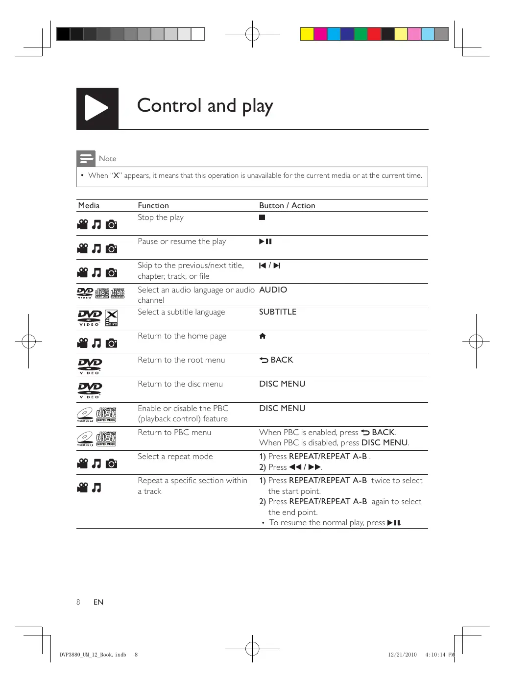 - When “X” appears, it means that this operation is unavailable for the current media or at the current time. Media Function Stop the play Button / Action Pause or resume the play Skip to the previous/next title, chapter, track, or file