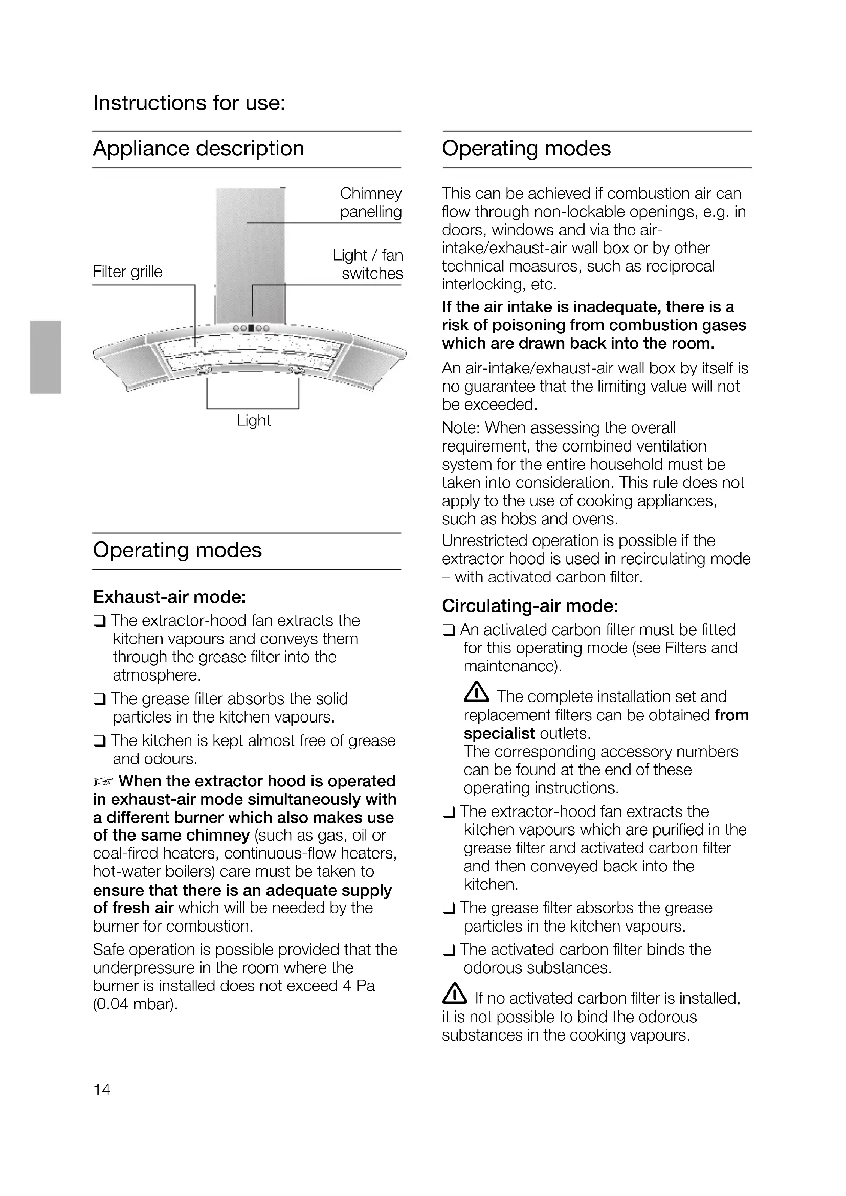 When the extractor hood is operated in exhaust-air mode simultaneously with a different burner which also makes use of the same chimney (such as gas, oil or coal-fired heaters, continuous-flow heaters, hot-water boilers) care must be taken to ensure that there is an adequate supply of fresh air which will be needed by the burner for combustion. Safe operation is possible provided that the underpressure in the room where the burner is installed does not exceed 4 Pa (0.04 mbar). Operating modes This can be achieved if combustion air can flow through non-lockable openings, e.g. in doors, windows and via the air- intake/exhaust-air wall box or by other technical measures, such as reciprocal interlocking, etc. If the air intake is inadequate, there is a risk of poisoning from combustion gases which are drawn back into the room. An air-intake/exhaust-air wall box by itself is no guarantee that the limiting value will not be exceeded. Note: When assessing the overall requirement, the combined ventilation system for the entire household must be taken into consideration. This rule does not apply to the use of cooking appliances, such as hobs and ovens. Unrestricted operation is possible if the extractor hood is used in recirculating mode – with activated carbon filter. Circulating-air mode: ❑ An activated carbon filter must be fitted for this operating mode (see Filters and maintenance). The complete installation set and replacement filters can be obtained from specialist outlets. The corresponding accessory numbers can be found at the end of these operating instructions. ❑ The extractor-hood fan extracts the kitchen vapours which are purified in the grease filter and activated carbon filter and then conveyed back into the kitchen. ❑ The grease filter absorbs the grease particles in the kitchen vapours. ❑ The activated carbon filter binds the odorous substances. If no activated carbon filter is installed, it is not possible to bind the odorous substances in the cooking vapours. Instructions for use: Light / fan switches Chimney panelling Light Filter grilleBefore using for the first time If you encounter a problem If you have any questions or if a faultoccurs, please call Customer Service. (See list of Customer Service representatives).When you call, please quote the following: E-Nr. FD Enter the relevant numbers into the boxabove. The E-Nr. (product no.) and FD(production date) are shown on the nameplate which can be seen inside theextractor hood after the filter frame hasbeen detached.Important notes:❑ The Instructions for Use apply to severalversions of this appliance. Accordingly,you may find descriptions of individualfeatures that do not apply to your specific appliance.❑ This extractor hood complies with all relevant safety regulations.Repairs should be carried out by qualified technicians only.Improper repairs may put the user atconsiderable risk.❑ Before using your appliance for the firsttime, please read these Instructions forUse carefully. They contain importantinformation concerning your personalsafety as well as on use and care of theappliance.❑ Please retain the operating and installation instructions for a subsequentowner. Do not use the appliance if damaged. The appliance is not intended for use by young children or infirmed persons without supervision.Young children should be supervised toensure they do not play with the appliance. If the connecting cable for this appliance is damaged, the cable must bereplaced by the manufacturer or his customerservice or a similarly qualified person in orderto prevent serious injury to the user. The appliance may be connected to the mains by a qualified technician only. Dispose of packaging materials properly (see Installation instructions). This extractor hood is designed for domestic use only. Light bulbs must always be fitted when the extractor hood is in use. Defective bulbs should be replaced immediately to prevent the remaining bulbsfrom overloading. Never operate the extractor hood without a grease filter. Overheated fat or oil can easily catch fire. If you are cooking with fat or oil, e.g. chips,etc., never leave the cooker unattended. Do not flambé food directly under the extractor hood.Risk of grease filter catching fire due ! to flames. The hotplates must always be covered with a utensil. Restrictions apply to the use of the extractor hood over a solid-fuel burner(coal, wood, etc.). (See Installation instructions).Gas hobs / Gas cookers Do not use all the gas hotplates simultaneously for a prolonged period (max. 15 minutes) at maximum thermalload, otherwise there is a risk of burns if thehousing surfaces are touched or a risk ofdamage to the extractor hood. If the extractor hood is situated over a gas hob,operate the hood at maximum setting ifthree or more gas hotplates are operatedsimultaneously.