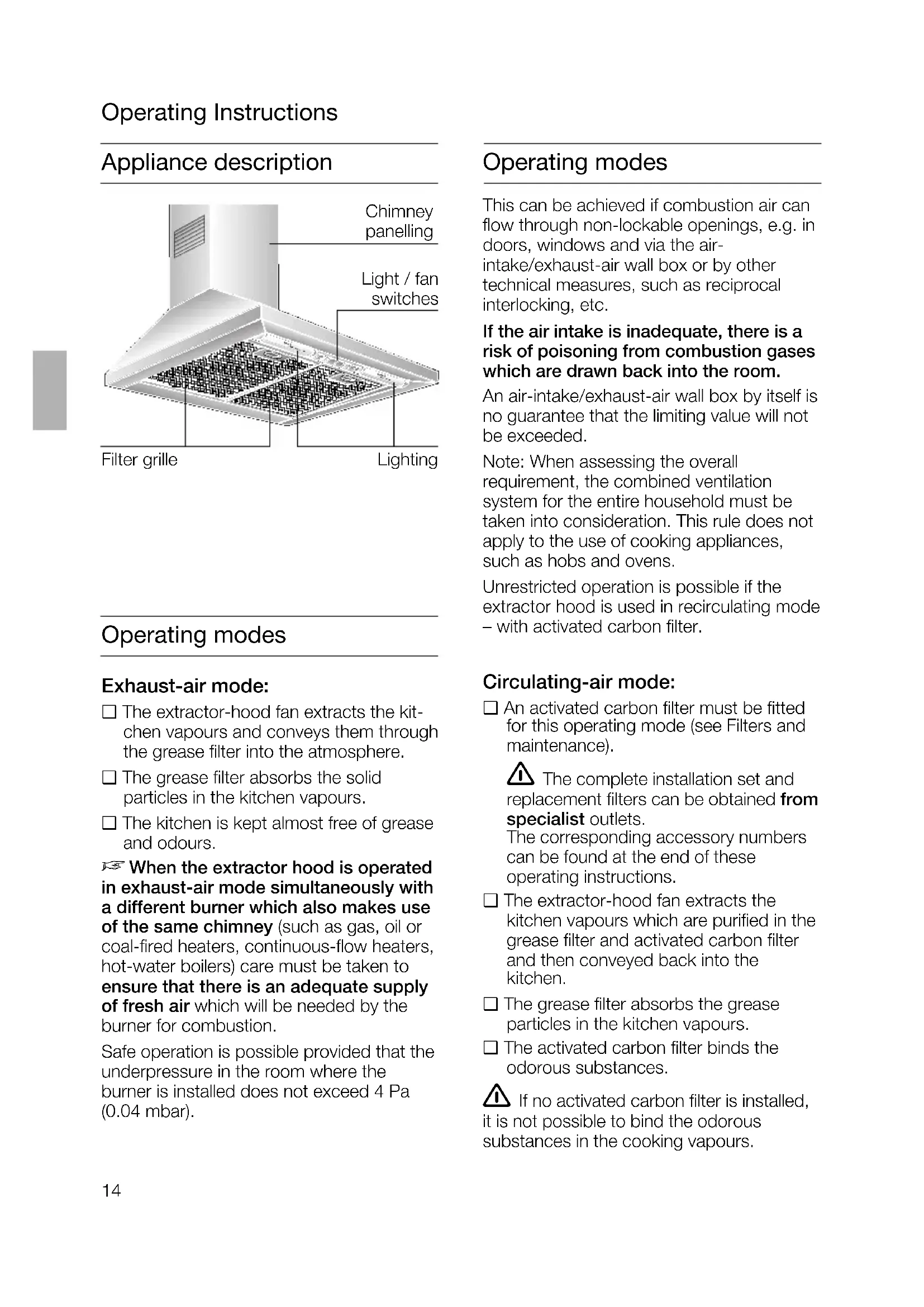 Appliance description Operating Instructions Operating modes Exhaust-air mode: ❑ The extractor-hood fan extracts the kit- chen vapours and conveys them through the grease filter into the atmosphere. ❑ The grease filter absorbs the solid particles in the kitchen vapours. ❑ The kitchen is kept almost free of grease and odours.