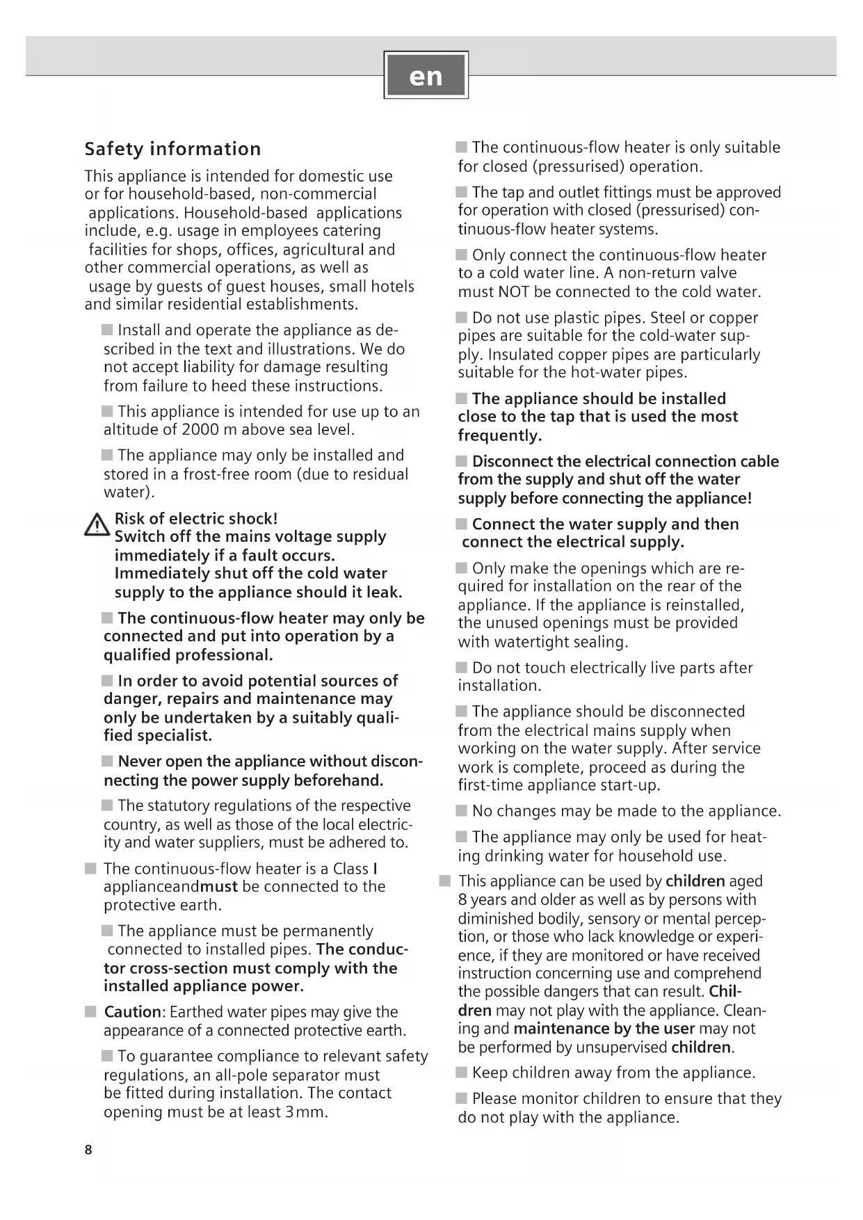 Safety information This appliance is intended for domestic use or for household-based, non-commercial applications. Household-based applications include, e.g. usage in employees catering facilities for shops, offices, agricultural and other commercial operations, as well as usage by guests of guest houses, small hotels and similar residential establishments. ■ Install and operate the appliance as de- scribed in the text and illustrations. We do not accept liability for damage resulting from failure to heed these instructions. ■ This appliance is intended for use up to an altitude of 2000 m above sea level. ■ The appliance may only be installed and stored in a frost-free room (due to residual water). Risk of electric shock! Switch off the mains voltage supply immediately if a fault occurs. Immediately shut off the cold water supply to the appliance should it leak. ■ The continuous-flow heater may only be connected and put into operation by a qualified professional. ■ In order to avoid potential sources of danger, repairs and maintenance may only be undertaken by a suitably quali- fied specialist. ■ Never open the appliance without discon- necting the power supply beforehand. ■ The statutory regulations of the respective country, as well as those of the local electric- ity and water suppliers, must be adhered to. ■ The continuous-flow heater is a Class I appliance and must be connected to the protective earth. ■ The appliance must be permanently connected to installed pipes. The conduc- tor cross-section must comply with the installed appliance power. ■ Caution: Earthed water pipes may give the appearance of a connected protective earth. ■ To guarantee compliance to relevant safety regulations, an all-pole separator must be fitted during installation. The contact opening must be at least 3 mm. ■ The continuous-flow heater is only suitable for closed (pressurised) operation. ■ The tap and outlet fittings must be approved for operation with closed (pressurised) con- tinuous-flow heater systems. ■ Only connect the continuous-flow heater to a cold water line. A non-return valve must NOT be connected to the cold water. ■ Do not use plastic pipes. Steel or copper pipes are suitable for the cold-water sup- ply. Insulated copper pipes are particularly suitable for the hot-water pipes. ■ The appliance should be installed close to the tap that is used the most frequently. ■ Disconnect the electrical connection cable from the supply and shut off the water supply before connecting the appliance! ■ Connect the water supply and then connect the electrical supply. ■ Only make the openings which are re- quired for installation on the rear of the appliance. If the appliance is reinstalled, the unused openings must be provided with watertight sealing. ■ Do not touch electrically live parts after installation. ■ The appliance should be disconnected from the electrical mains supply when working on the water supply. After service work is complete, proceed as during the first-time appliance start-up. ■ No changes may be made to the appliance. ■ The appliance may only be used for heat- ing drinking water for household use. ■ This appliance can be used by children aged 8 years and older as well as by persons with diminished bodily, sensory or mental percep- tion, or those who lack knowledge or experi- ence, if they are monitored or have received instruction concerning use and comprehend the possible dangers that can result. Chil- dren may not play with the appliance. Clean- ing and maintenance by the user may not be performed by unsupervised children. ■ Keep children away from the appliance. ■ Please monitor children to ensure that they do not play with the appliance.9