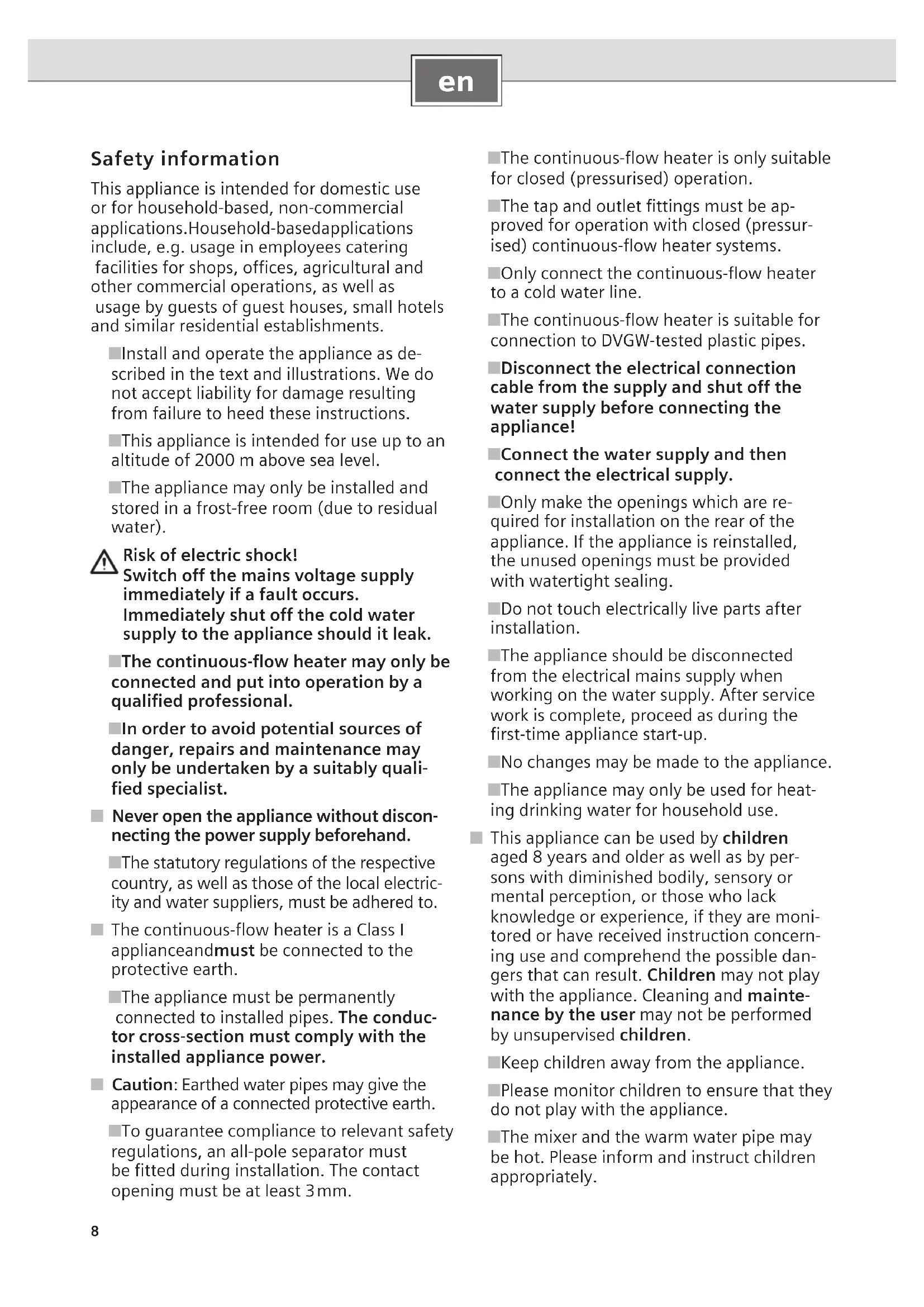Safety information This appliance is intended for domestic use or for household-based, non-commercial applications. Household-based applications include, e.g. usage in employees catering facilities for shops, offices, agricultural and other commercial operations, as well as usage by guests of guest houses, small hotels and similar residential establishments. ■ Install and operate the appliance as de- scribed in the text and illustrations. We do not accept liability for damage resulting from failure to heed these instructions. ■ This appliance is intended for use up to an altitude of 2000 m above sea level. ■ The appliance may only be installed and stored in a frost-free room (due to residual water). Risk of electric shock! Switch off the mains voltage supply immediately if a fault occurs. Immediately shut off the cold water supply to the appliance should it leak. ■ The continuous-flow heater may only be connected and put into operation by a qualified professional. ■ In order to avoid potential sources of danger, repairs and maintenance may only be undertaken by a suitably quali- fied specialist. ■ Never open the appliance without discon- necting the power supply beforehand. ■ The statutory regulations of the respective country, as well as those of the local electric- ity and water suppliers, must be adhered to. ■ The continuous-flow heater is a Class I appliance and must be connected to the protective earth. ■ The appliance must be permanently connected to installed pipes. The conduc- tor cross-section must comply with the installed appliance power. ■ Caution: Earthed water pipes may give the appearance of a connected protective earth. ■ To guarantee compliance to relevant safety regulations, an all-pole separator must be fitted during installation. The contact opening must be at least 3 mm. ■ The continuous-flow heater is only suitable for closed (pressurised) operation. ■ The tap and outlet fittings must be ap- proved for operation with closed (pressur- ised) continuous-flow heater systems. ■ Only connect the continuous-flow heater to a cold water line. ■ The continuous-flow heater is suitable for connection to DVGW-tested plastic pipes. ■ Disconnect the electrical connection cable from the supply and shut off the water supply before connecting the appliance! ■ Connect the water supply and then connect the electrical supply. ■ Only make the openings which are re- quired for installation on the rear of the appliance. If the appliance is reinstalled, the unused openings must be provided with watertight sealing. ■ Do not touch electrically live parts after installation. ■ The appliance should be disconnected from the electrical mains supply when working on the water supply. After service work is complete, proceed as during the first-time appliance start-up. ■ No changes may be made to the appliance. ■ The appliance may only be used for heat- ing drinking water for household use. ■ This appliance can be used by children aged 8 years and older as well as by per- sons with diminished bodily, sensory or mental perception, or those who lack knowledge or experience, if they are moni- tored or have received instruction concern- ing use and comprehend the possible dan- gers that can result. Children may not play with the appliance. Cleaning and mainte- nance by the user may not be performed by unsupervised children. ■ Keep children away from the appliance. ■ Please monitor children to ensure that they do not play with the appliance. ■ The mixer and the warm water pipe may be hot. Please inform and instruct children appropriately.9