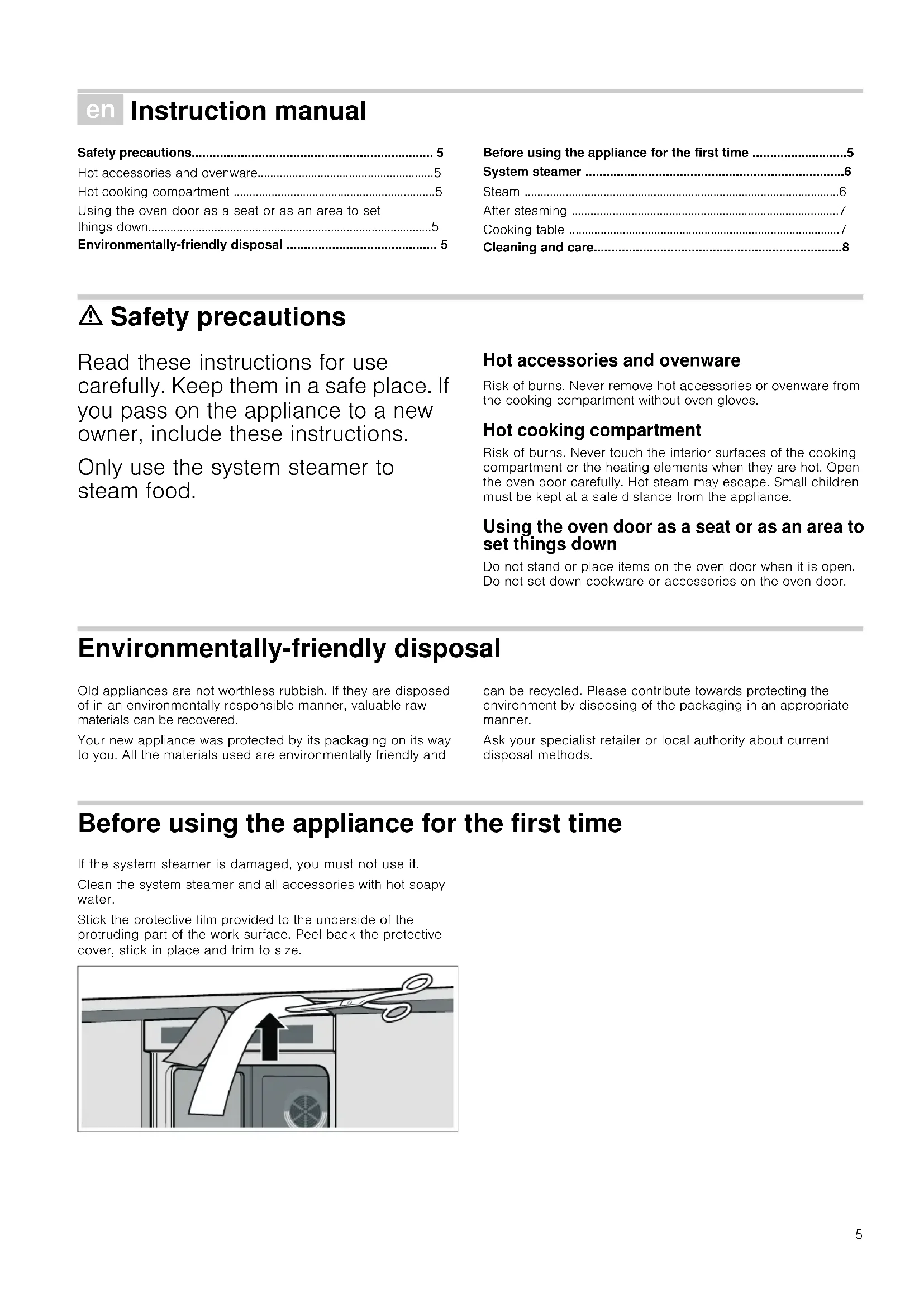 - Cleaning and care ã=Safety precautions Read these instructions for use carefully. Keep them in a safe place. If you pass on the appliance to a new owner, include these instructions. Only use the system steamer to steam food. Hot accessories and ovenware Risk of burns. Never remove hot accessories or ovenware from the cooking compartment without oven gloves. Hot cooking compartment Risk of burns. Never touch the interior surfaces of the cooking compartment or the heating elements when they are hot. Open the oven door carefully. Hot steam may escape. Small children must be kept at a safe distance from the appliance. Using the oven door as a seat or as an area to set things down Do not stand or place items on the oven door when it is open. Do not set down cookware or accessories on the oven door. Environmentally-friendly disposal Old appliances are not worthless rubbish. If they are disposed of in an environmentally responsible manner, valuable raw materials can be recovered. Your new appliance was protected by its packaging on its way to you. All the materials used are environmentally friendly and can be recycled. Please contribute towards protecting the environment by disposing of the packaging in an appropriate manner. Ask your specialist retailer or local authority about current disposal methods. Before using the appliance for the first time If the system steamer is damaged, you must not use it. Clean the system steamer and all accessories with hot soapy water. Stick the protective film provided to the underside of the protruding part of the work surface. Peel back the protective cover, stick in place and trim to size.6 System steamer The essential elements of the system steamer are the extra-deep pan, the large steamer tray and the glass lid.For larger quantities and for preparing rice or sauces, you can also use the rack with the cooking containers.Only use the original parts supplied.You can find further information about steaming in the enclosed booklet.You can also use the extra-deep pan individually to prepare large quantities of bakes, for example. Steam Do not open the oven during cooking. Exception: When combining different foods that have considerable differences in their cooking times.The cooking time is determined by the size of the food being cooked. If you are simultaneously cooking food with different cooking times:■ Cut the food with the longer cooking time into smaller pieces■ Lengthen the cooking time for delicate foods by cooking larger pieces.In general, 500 ml of water (no distilled water) is used for steaming. Exception: Foods that soak up water (e.g. potatoes) and ingredients with long cooking times require 750 ml of water (see the cooking table or enclosed booklet). p. 8