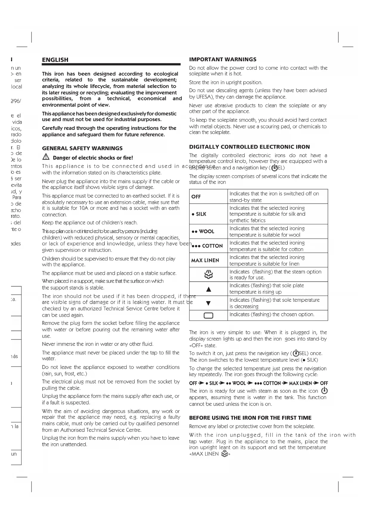 ENGLISH This iron has been designed according to ecological criteria, related to the sustainable development; analyzing its whole lifecycle, from material selection to its later reusing or recycling; evaluating the improvement possibilities, from a technical, economical and environmental point of view. This appliance has been designed exclusively for domestic use and must not be used for industrial purposes. Carefully read through the operating instructions for the appliance and safeguard them for future reference.