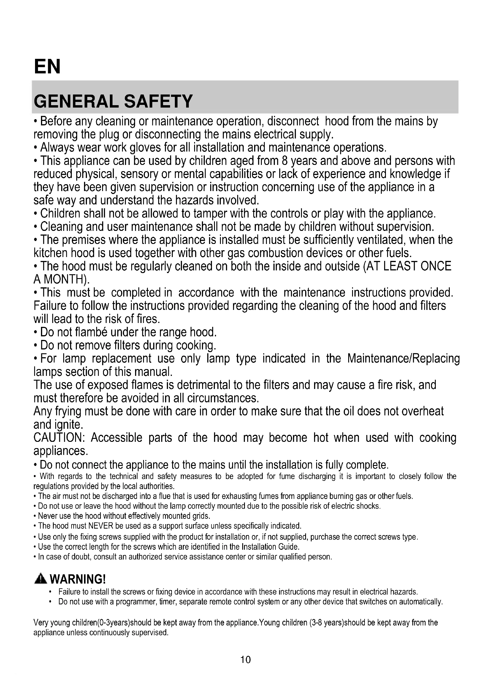 - Before any cleaning or maintenance operation, disconnect hood from the mains by removing the plug or disconnecting the mains electrical supply.