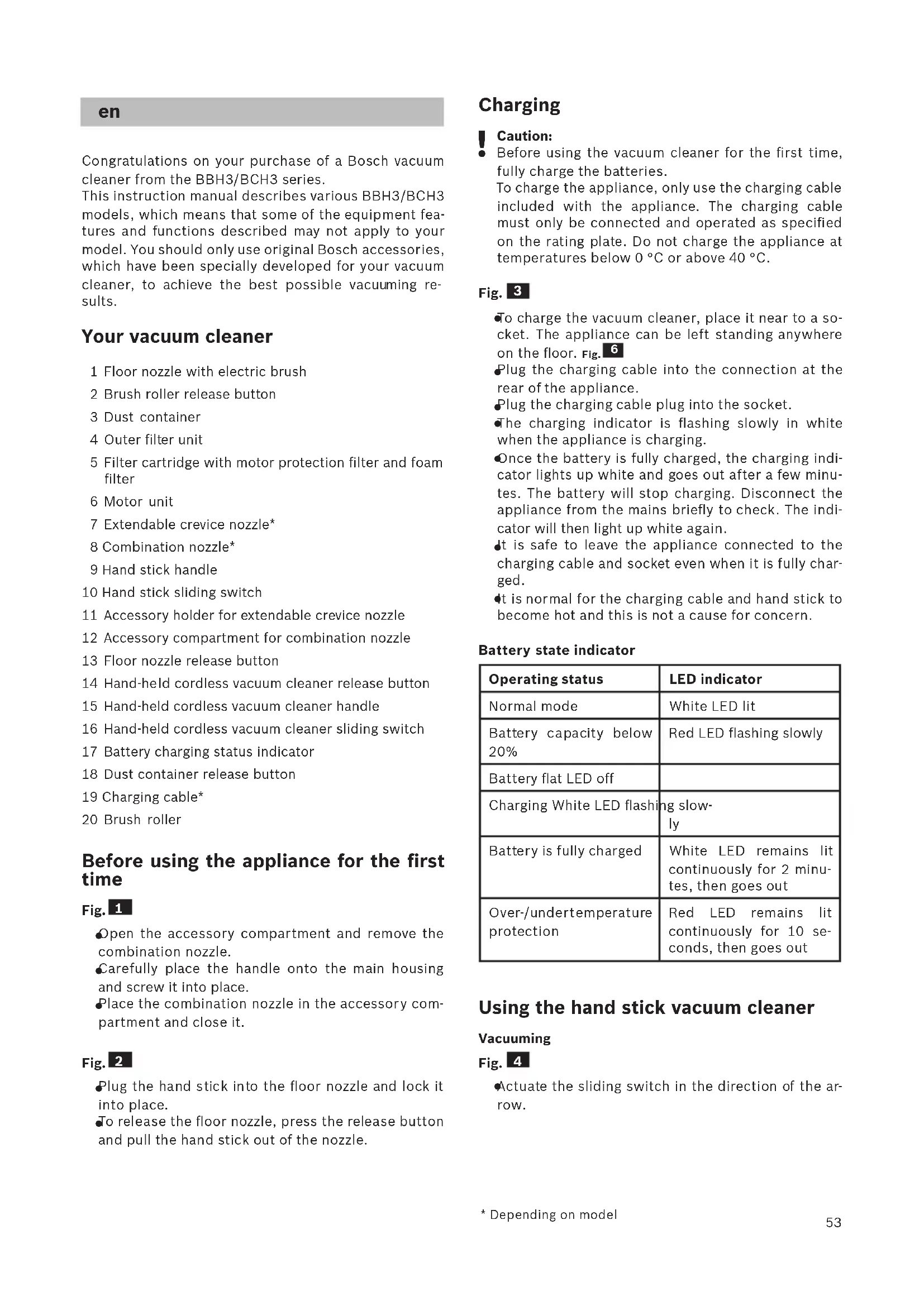 Congratulations on your purchase of a Bosch vacuum cleaner from the BBH3/BCH3 series. This instruction manual describes various BBH3/BCH3 mode ls, which means that some of the equipment fea- tures and functions described may not apply to your mode l. You should only use original Bosch accessories, which have been specially developed for your vacuum cleaner, to achieve the best possible vacuu ming re- sults. Your vacuum cleaner 1 Floor nozzle with electric brush 2 Brush roller release button 3 Dust container 4 Outer filter unit 5 Filter cartridge with motor protection filter and foam filter 6 Motor unit 7 Extendable crevice nozzle* 8 Combination nozzle* 9 Hand stick handle 10 Hand stick sliding switch 11 Accessory holder for extendable crevice nozzle 12 Accessory compartment for combination nozzle 13 Floor nozzle release button 14 Hand-he ld cordless vacuum cleaner release button 15 Hand-held cordless vacuum cleaner handle 16 Hand-held cordless vacuum cleaner sliding switch 17 Battery charging status indicator 18 Dust container release button 19 Charging cable* 20 Brush roller Before using the appliance for the first time Fig.