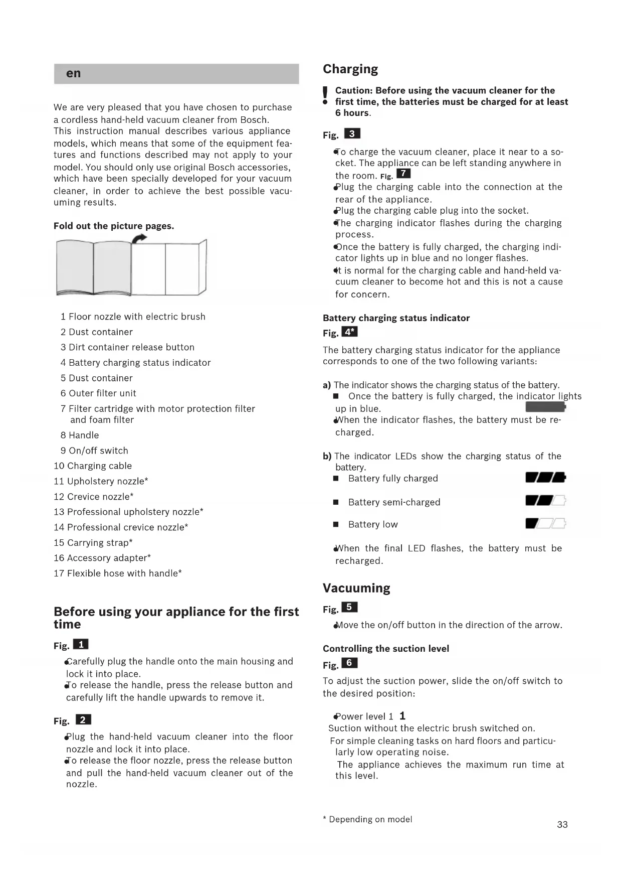 - je nach Ausstattung33 We are very pleased that you have chosen to purchase a cordless hand-held vacuum cleaner from Bosch. This instruction manual describes various appliance models, which means that some of the equipment fea- tures and functions described may not apply to your model. You should only use original Bosch accessories, which have been specially developed for your vacuum cleaner, in order to achieve the best possible vacu- uming results. Fold out the picture pages. 1 Floor nozzle with electric brush 2 Dust container 3 Dirt container release button 4 Battery charging status indicator 5 Dust container 6 Outer filter unit 7 Filter cartridge with motor protection filter and foam filter 8 Handle 9 On/off switch 10 Charging cable 11 Upholstery nozzle* 12 Crevice nozzle* 13 Professional upholstery nozzle* 14 Professional crevice nozzle* 15 Carrying strap* 16 Accessory adapter* 17 Flexible hose with handle* Before using your appliance for the first time Fig.
