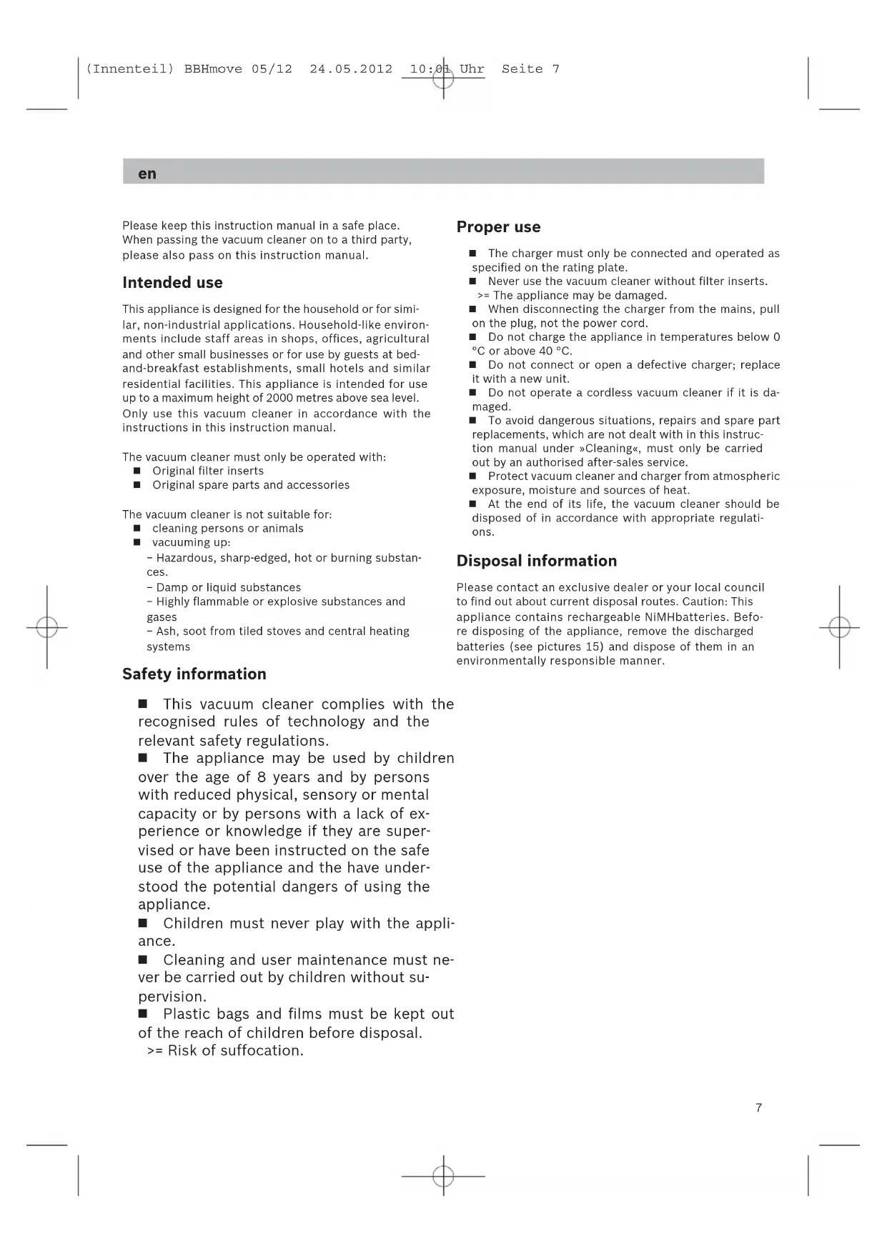 (Innenteil) BBHmove 05/12 24.05.2012 10:01 Uhr Seite 6en (Innenteil) BBHmove 05/12 24.05.2012 10:01 Uhr Seite 7 Please keep this instruction manual in a safe place. When passing the vacuum cleaner on to a third party, please also pass on this instruction manual. Intended use This appliance is designed for the household or for simi- lar, non-industrial applications. Household-like environ- ments include staff areas in shops, offices, agricultural and other small businesses or for use by guests at bed- and-breakfast establishments, small hotels and similar residential facilities. This appliance is intended for use up to a maximum height of 2000 metres above sea level. Only use this vacuum cleaner in accordance with the instructions in this instruction manual. The vacuum cleaner must only be operated with: Original filter inserts Original spare parts and accessories The vacuum cleaner is not suitable for: cleaning persons or animals vacuuming up: − Hazardous, sharp-edged, hot or burning substan- ces. − Damp or liquid substances − Highly flammable or explosive substances and gases − Ash, soot from tiled stoves and central heating systems Safety information This vacuum cleaner complies with the recognised rules of technology and the relevant safety regulations. The appliance may be used by children over the age of 8 years and by persons with reduced physical, sensory or mental capacity or by persons with a lack of ex- perience or knowledge if they are super- vised or have been instructed on the safe use of the appliance and the have under- stood the potential dangers of using the appliance. Children must never play with the appli- ance. Cleaning and user maintenance must ne- ver be carried out by children without su- pervision. Plastic bags and films must be kept out of the reach of children before disposal. >= Risk of suffocation. Proper use The charger must only be connected and operated as specified on the rating plate. Never use the vacuum cleaner without filter inserts. >= The appliance may be damaged. When disconnecting the charger from the mains, pull on the plug, not the power cord. Do not charge the appliance in temperatures below 0 °C or above 40 °C. Do not connect or open a defective charger; replace it with a new unit. Do not operate a cordless vacuum cleaner if it is da- maged. To avoid dangerous situations, repairs and spare part replacements, which are not dealt with in this instruc- tion manual under »Cleaning«, must only be carried out by an authorised after-sales service. Protect vacuum cleaner and charger from atmospheric exposure, moisture and sources of heat. At the end of its life, the vacuum cleaner should be disposed of in accordance with appropriate regulati- ons. Disposal information Please contact an exclusive dealer or your local council to find out about current disposal routes. Caution: This appliance contains rechargeable NiMHbatteries. Befo- re disposing of the appliance, remove the discharged batteries (see pictures 15) and dispose of them in an environmentally responsible manner.