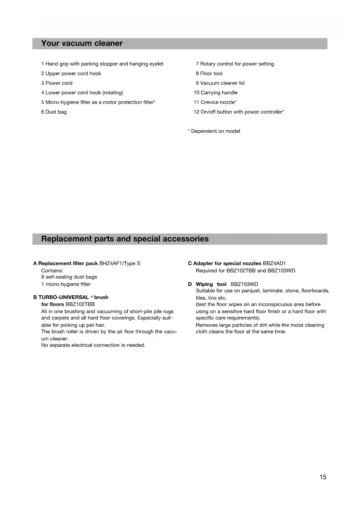 BBZ4AD1Your vacuum cleaner Replacement parts and special accessories 1 Hand grip with parking stopper and hanging eyelet 2 Upper power cord hook 3 Power cord 4 Lower power cord hook (rotating) 5 Micro-hygiene filter as a motor protection filter* 6 Dust bag 7 Rotary control for power setting 8 Floor tool 9 Vacuum cleaner lid 10 Carrying handle 11 Crevice nozzle* 12 On/off button with power controller*