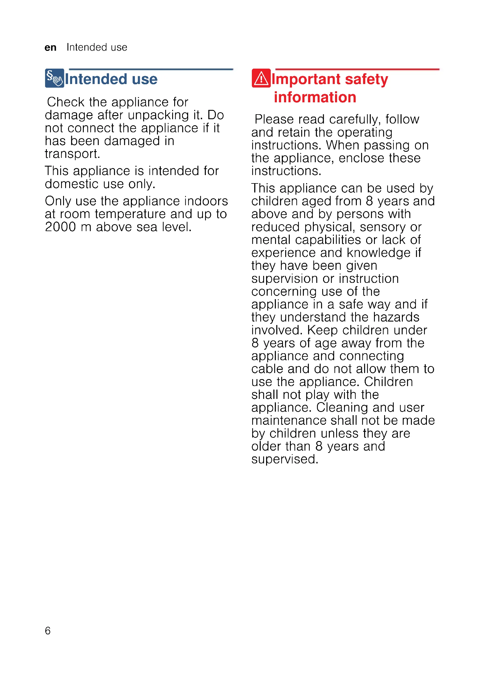 8 Intended use Intended use Check the appliance for damage after unpacking it. Do not connect the appliance if it has been damaged in transport. This appliance is intended for domestic use only. Only use the appliance indoors at room temperature and up to 2000 m above sea level. ( Important safety information Impor t ant saf et y informat i on Please read carefully, follow and retain the operating instructions. When passing on the appliance, enclose these instructions. This appliance can be used by children aged from 8years and above and by persons with reduced physical, sensory or mental capabilities or lack of experience and knowledge if they have been given supervision or instruction concerning use of the appliance in a safe way and if they understand the hazards involved. Keep children under 8years of age away from the appliance and connecting cable and do not allow them to use the appliance. Children shall not play with the appliance. Cleaning and user maintenance shall not be made by children unless they are older than 8years and supervised.Important safety information en
