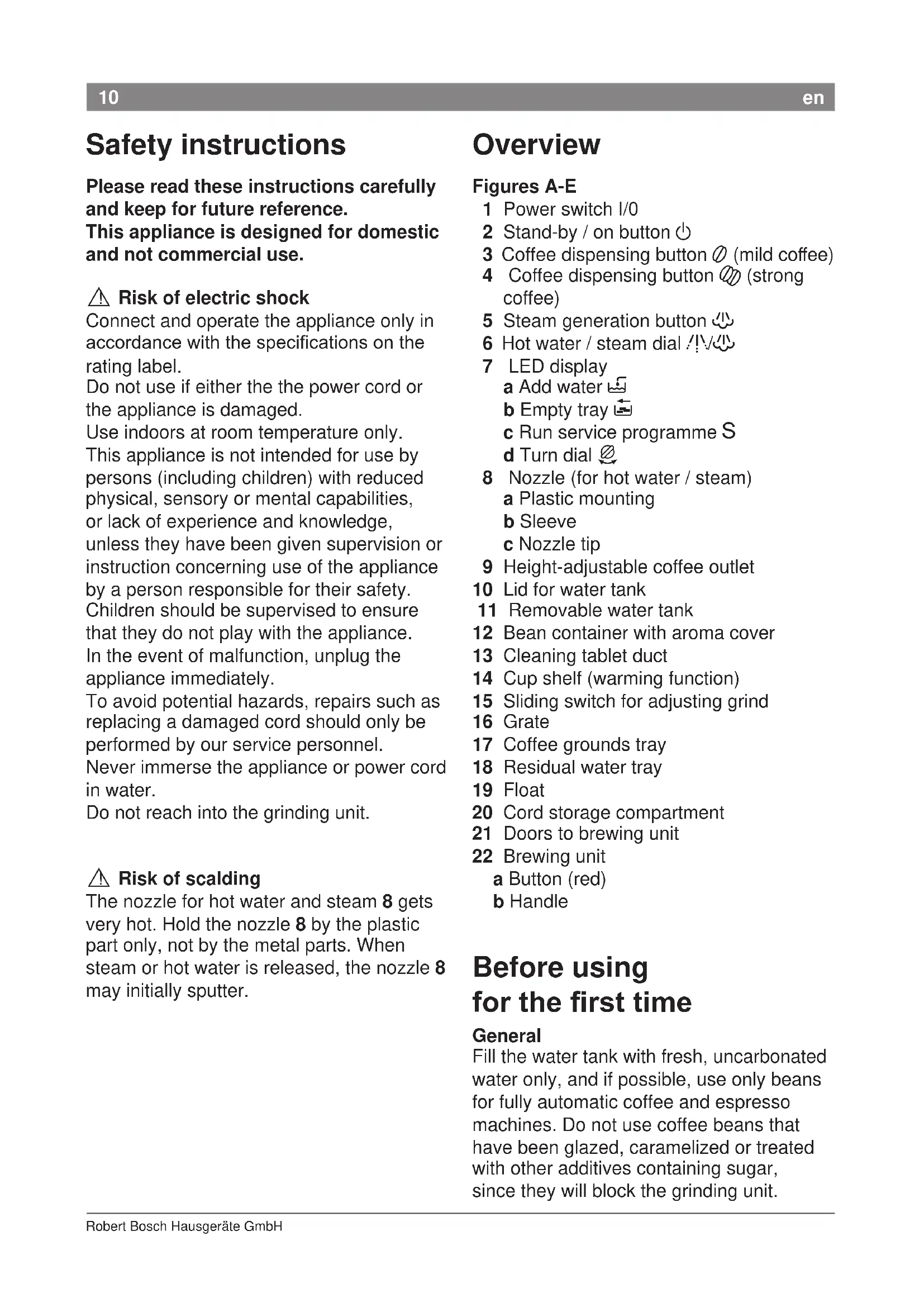 ! Risk of scalding The nozzle for hot water and steam 8 gets very hot. Hold the nozzle 8 by the plastic part only, not by the metal parts. When steam or hot water is released, the nozzle 8 may initially sputter. Overview Figures A-E 1 Power switch I/0 2 Stand-by / on button a 3 Coffee dispensing button 5 (mild coffee) 4 Coffee dispensing button K (strong coffee) 5 Steam generation button h 6 Hot water / steam dial g/h 7 LED display a Add water H b Empty tray I c Run service programme S d Turn dial J 8 Nozzle (for hot water / steam) a Plastic mounting b Sleeve c Nozzle tip 9 Height-adjustable coffee outlet 10 Lid for water tank 11 Removable water tank 12 Bean container with aroma cover 13 Cleaning tablet duct 14 Cup shelf (warming function) 15 Sliding switch for adjusting grind 16 Grate 17 Coffee grounds tray 18 Residual water tray 19 Float 20 Cord storage compartment 21 Doors to brewing unit 22 Brewing unit a Button (red) b Handle Before using for the rst time General Fill the water tank with fresh, uncarbonated water only, and if possible, use only beans for fully automatic coffee and espresso machines. Do not use coffee beans that have been glazed, caramelized or treated with other additives containing sugar, since they will block the grinding unit.11 TCA52 09/2007