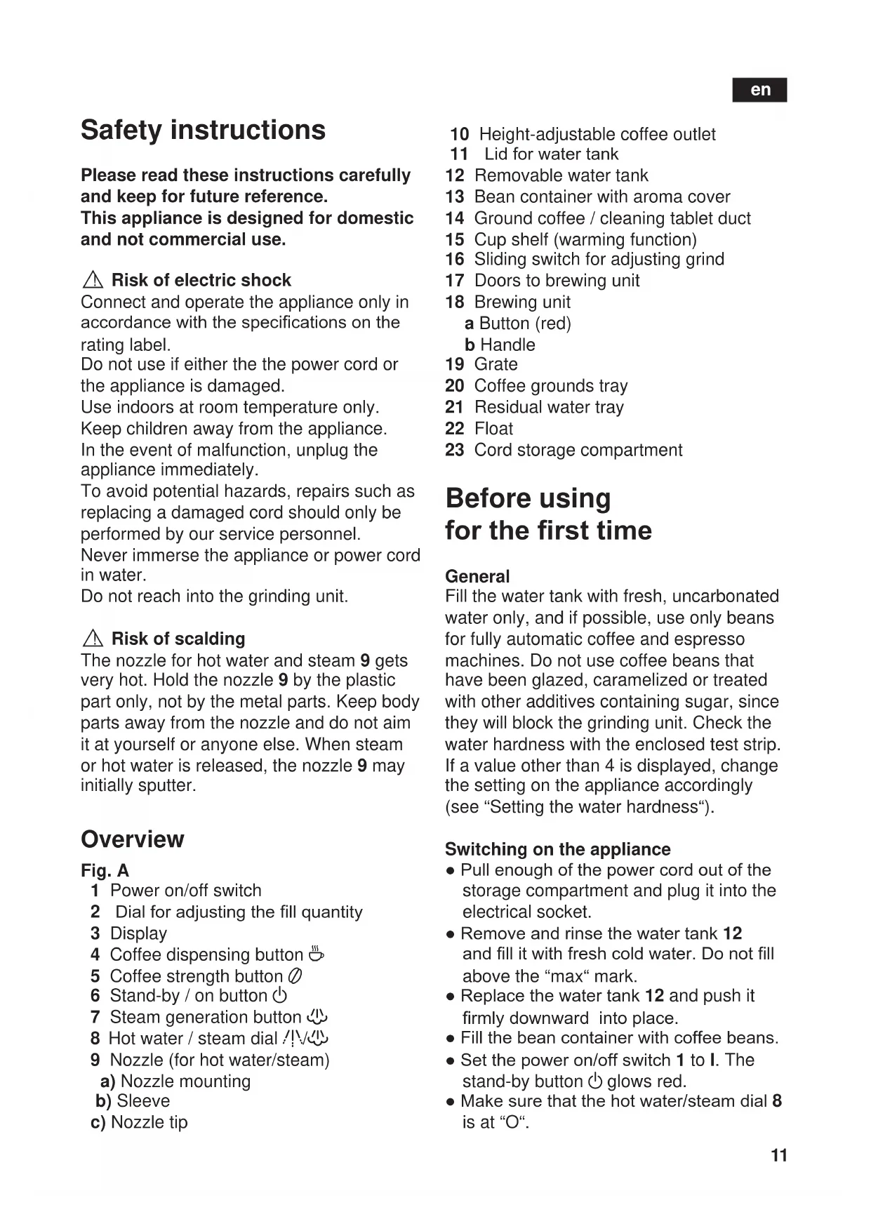 ! Risk of scalding The nozzle for hot water and steam 9 gets very hot. Hold the nozzle 9 by the plastic part only, not by the metal parts. Keep body parts away from the nozzle and do not aim it at yourself or anyone else. When steam or hot water is released, the nozzle 9 may initially sputter. Overview Fig. A 1 Power on/off switch 2 Dialforadjustingthellquantity 3 Display 4 Coffee dispensing button 4 5 Coffee strength button 5 6 Stand-by / on button a 7 Steam generation button h 8 Hot water / steam dial g/h 9 Nozzle (for hot water/steam) a) Nozzle mounting b) Sleeve c) Nozzle tip 10 Height-adjustable coffee outlet 11 Lidforwatertank 12 Removable water tank 13 Bean container with aroma cover 14 Ground coffee / cleaning tablet duct 15 Cup shelf (warming function) 16 Sliding switch for adjusting grind 17 Doors to brewing unit 18 Brewing unit a Button (red) b Handle 19 Grate 20 Coffee grounds tray 21 Residual water tray 22 Float 23 Cord storage compartment Before using for the rst time General Fill the water tank with fresh, uncarbonated water only, and if possible, use only beans for fully automatic coffee and espresso machines. Do not use coffee beans that have been glazed, caramelized or treated with other additives containing sugar, since they will block the grinding unit. Check the water hardness with the enclosed test strip. If a value other than 4 is displayed, change the setting on the appliance accordingly (see “Setting the water hardness“). Switching on the appliance ●Pullenoughofthepowercordoutofthe storage compartment and plug it into the electrical socket. ●Removeandrinsethewatertank12 andllitwithfreshcoldwater.Donotll above the “max“ mark. ●Replacethewatertank12 and push it rmlydownwardintoplace. ●Fillthebeancontainerwithcoffeebeans. ●Setthepoweron/offswitch1 to I. The stand-by button a glows red. ●Makesurethatthehotwater/steamdial8 is at “O“.12