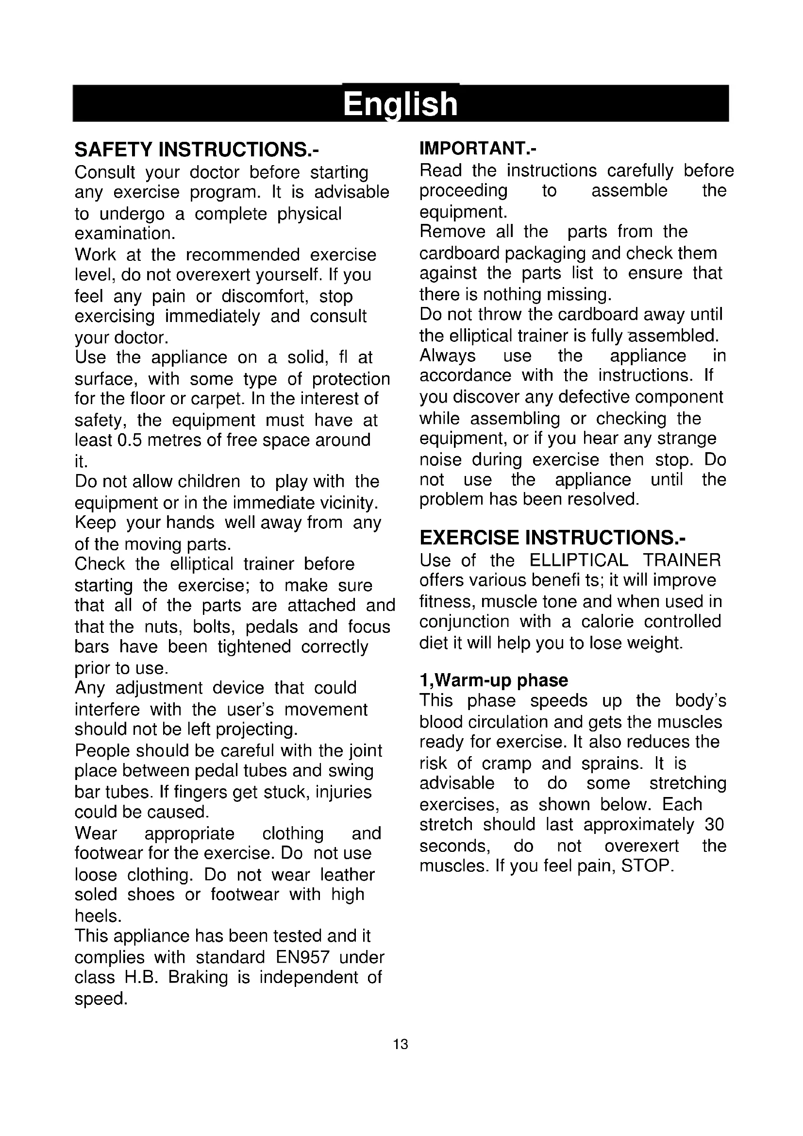 Always use the appliance in accordance with the instructions. If you discover any defective component while assembling or checking the equipment, or if you hear any strange noise during exercise then stop. Do not use the appliance until the problem has been resolved.