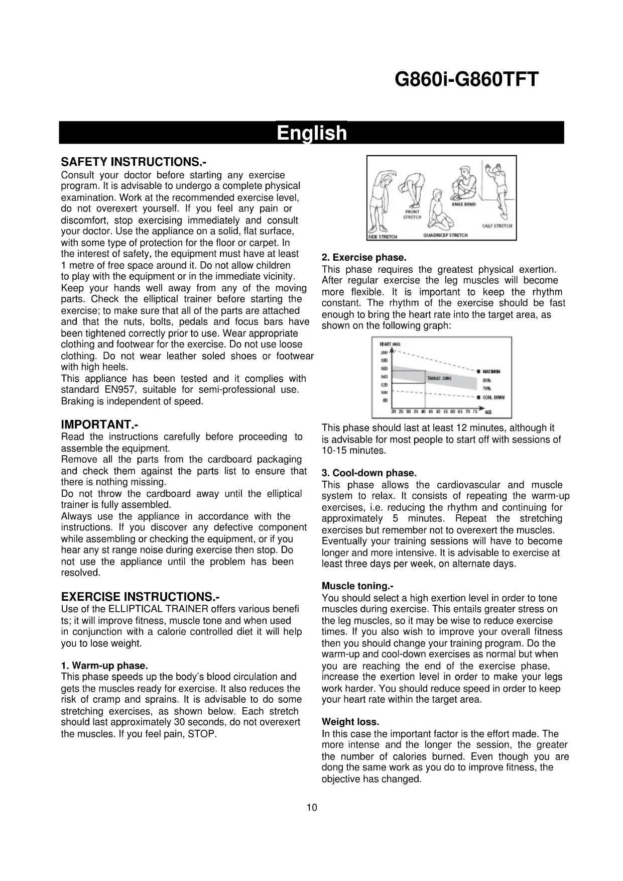 | AGE | HEART RATE | | --- | --- | | 20 | 160 | | 35 | 140 | | 40 | 120 | | 75 | 100 |Consult your doctor before starting any exercise program. It is advisable to undergo a complete physical examination. Work at the recommended exercise level, do not overexert yourself. If you feel any pain or discomfort, stop exercising immediately and consult your doctor. Use the appliance on a solid, flat surface, with some type of protection for the floor or carpet. In the interest of safety, the equipment must have at least 1 metre of free space around it. Do not allow children to play with the equipment or in the immediate vicinity. Keep your hands well away from any of the moving parts. Check the elliptical trainer before starting the exercise; to make sure that all of the parts are attached and that the nuts, bolts, pedals and focus bars have been tightened correctly prior to use. Wear appropriate clothing and footwear for the exercise. Do not use loose clothing. Do not wear leather soled shoes or footwear with high heels.