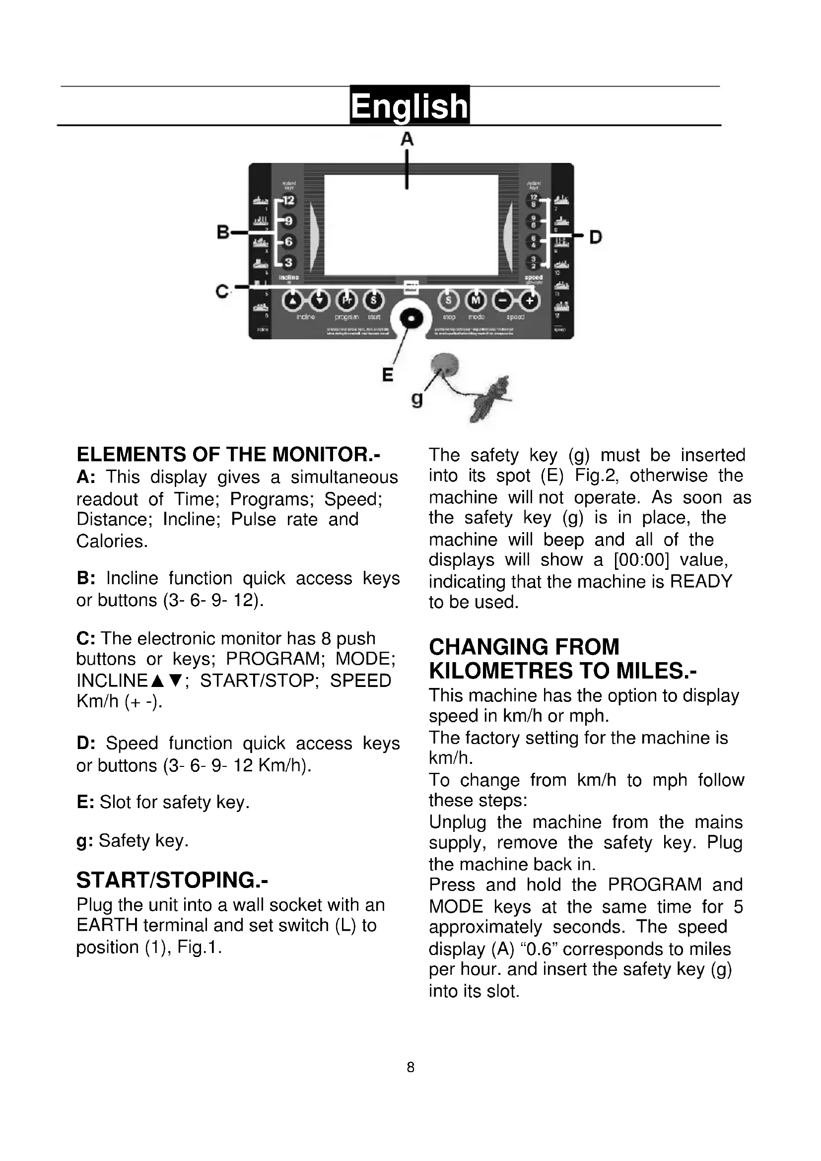 C: The electronic monitor has 8 push buttons or keys; PROGRAM; MODE; INCLINE▲▼; START/STOP; SPEED Km/h (+ -).