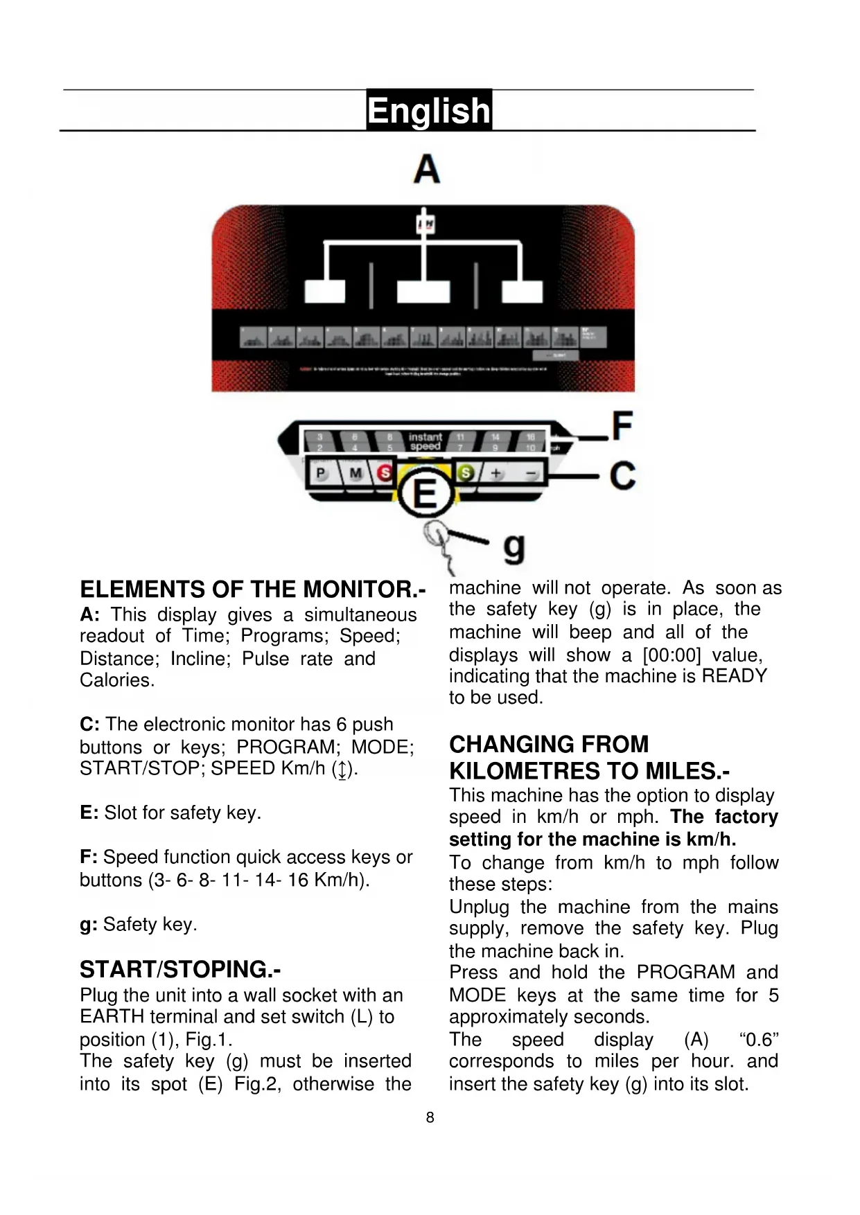 The speed display (A) "0.6" corresponds to miles per hour. and insert the safety key (g) into its slot.