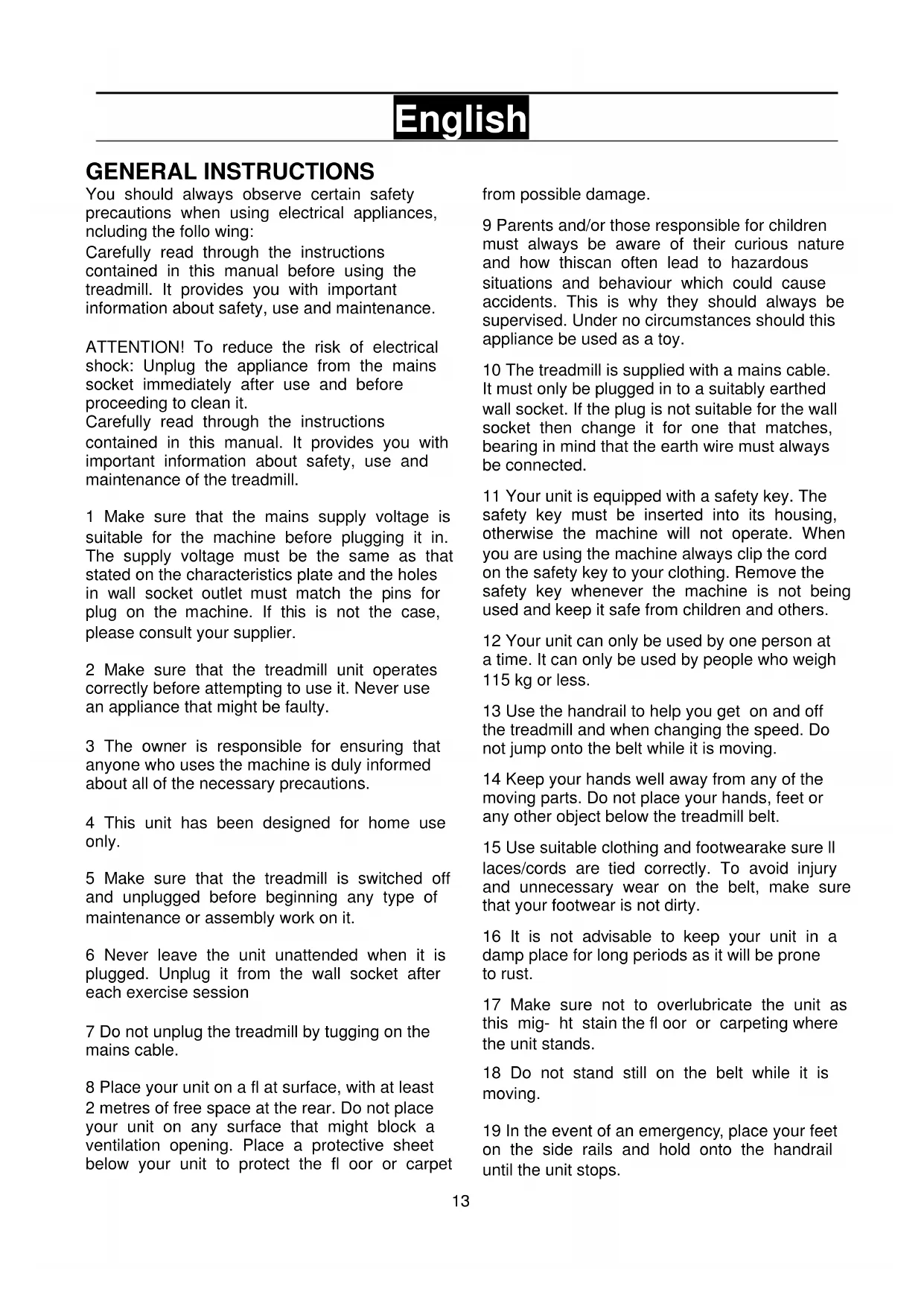 13 Use the handrail to help you get on and off the treadmill and when changing the speed. Do not jump onto the belt while it is moving.