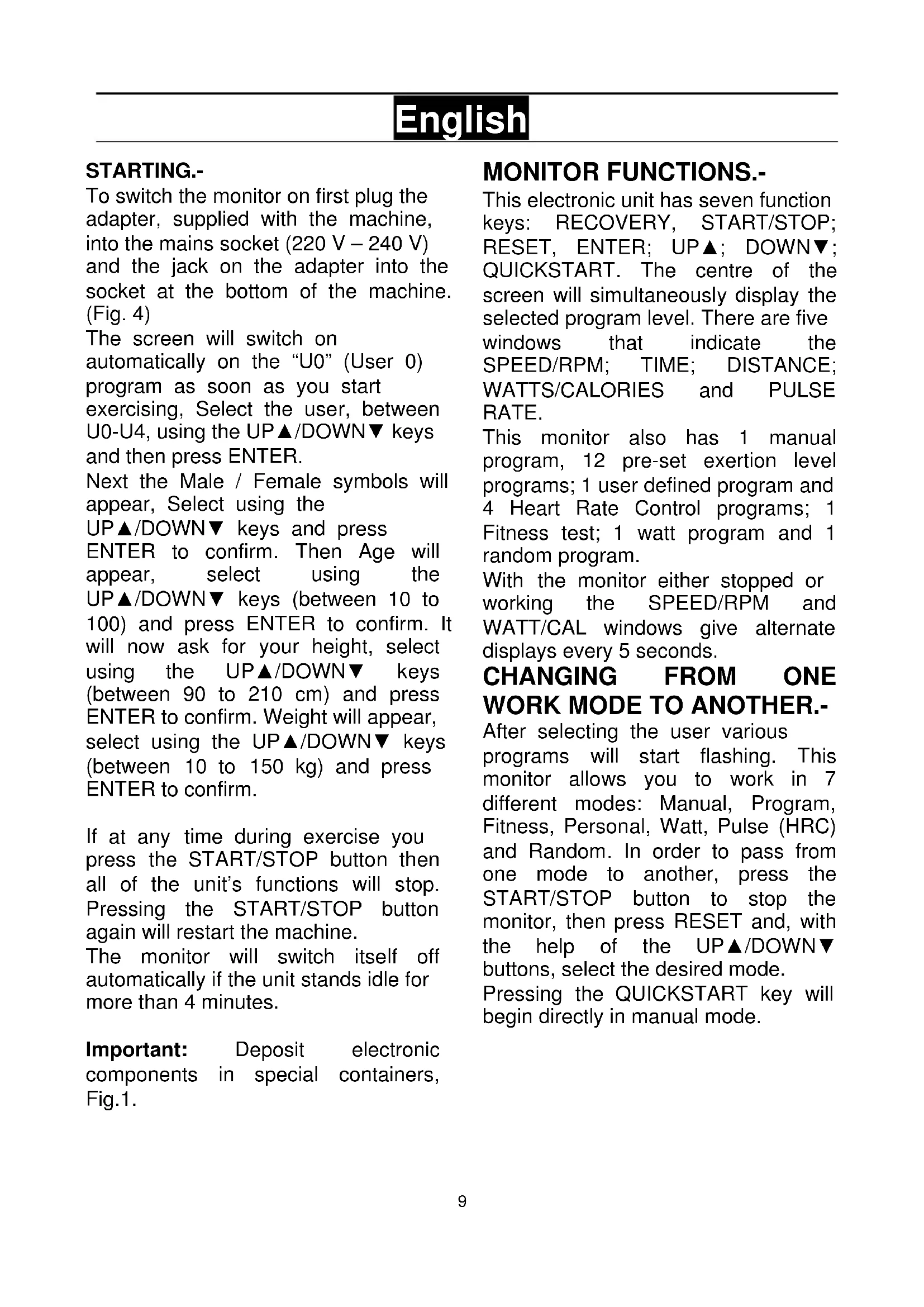 If, after selecting manual mode, you press the ENTER key three times the calorie window will start flashing. By pressing the UP▲/DOWN▼ keys you can program the calories for the exercise (between 10-990 Cal.). Select the calories and press START/STOP to begin the exercise. The calories will begin to count down until they reach zero and the monitor will beep several times to advise you that you have reached the programmed value.
