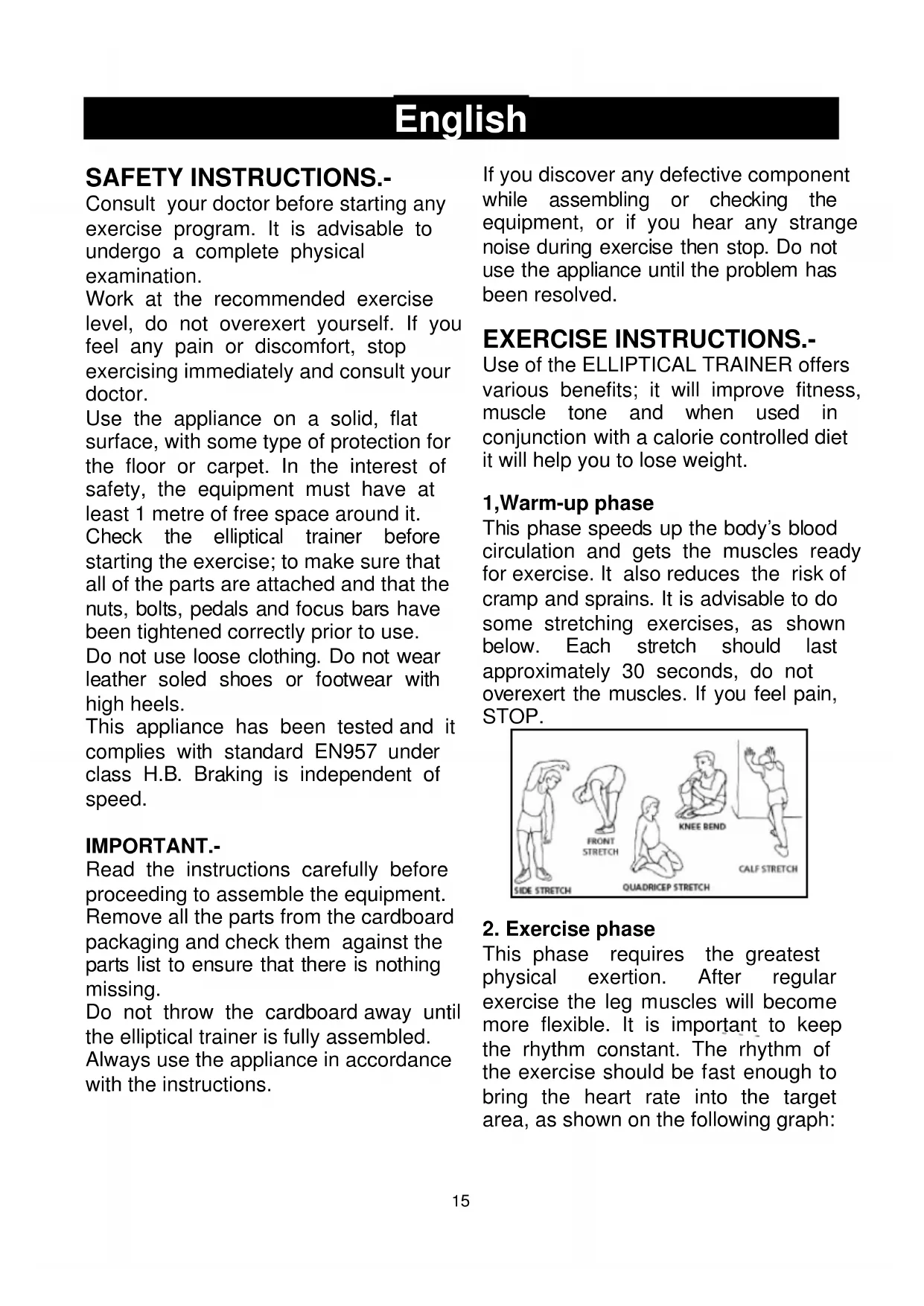 Use the appliance on a solid, flat surface, with some type of protection for the floor or carpet. In the interest of safety, the equipment must have at least 1 metre of free space around it. Check the elliptical trainer before starting the exercise; to make sure that all of the parts are attached and that the nuts, bolts, pedals and focus bars have been tightened correctly prior to use. Do not use loose clothing. Do not wear leather soled shoes or footwear with high heels.
