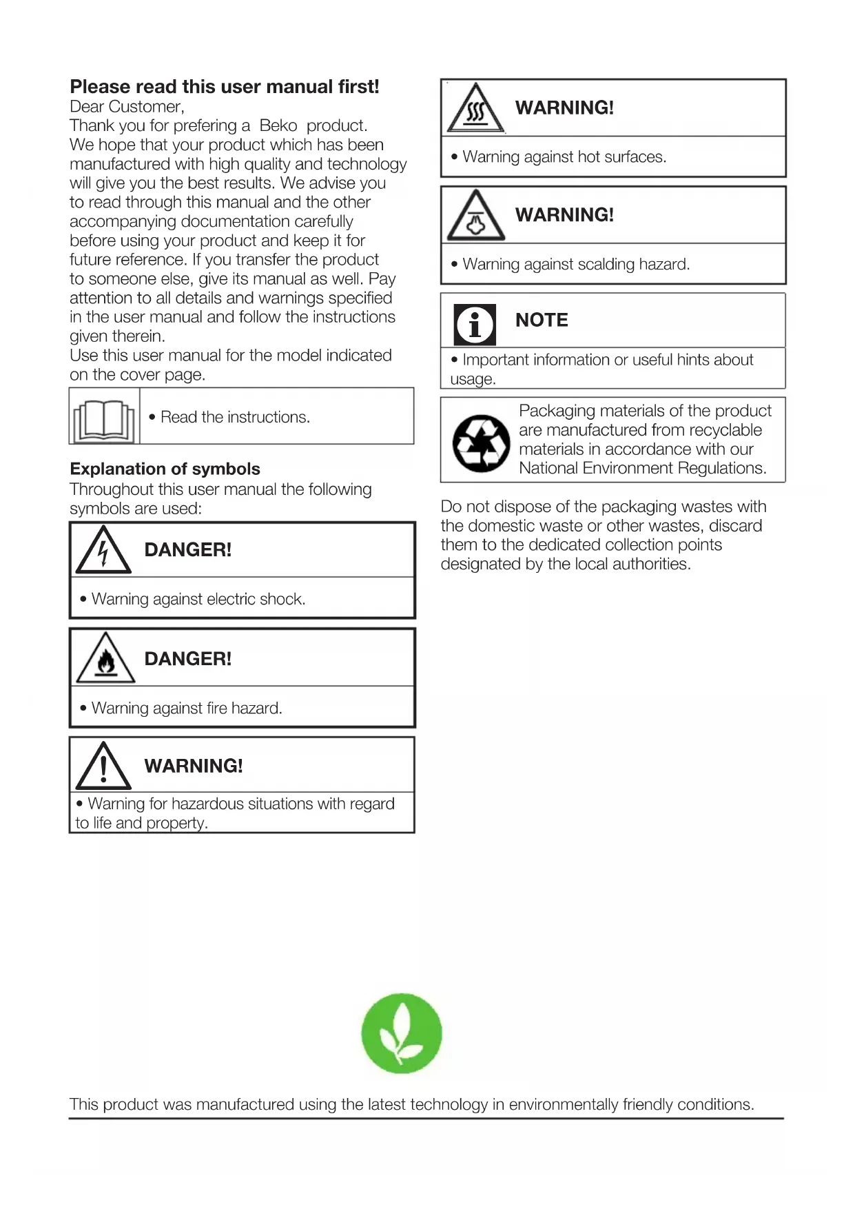 - Warning for hazardous situations with regard to life and property. This product was manufactured using the latest technology in environmentally friendly conditions. WARNING!