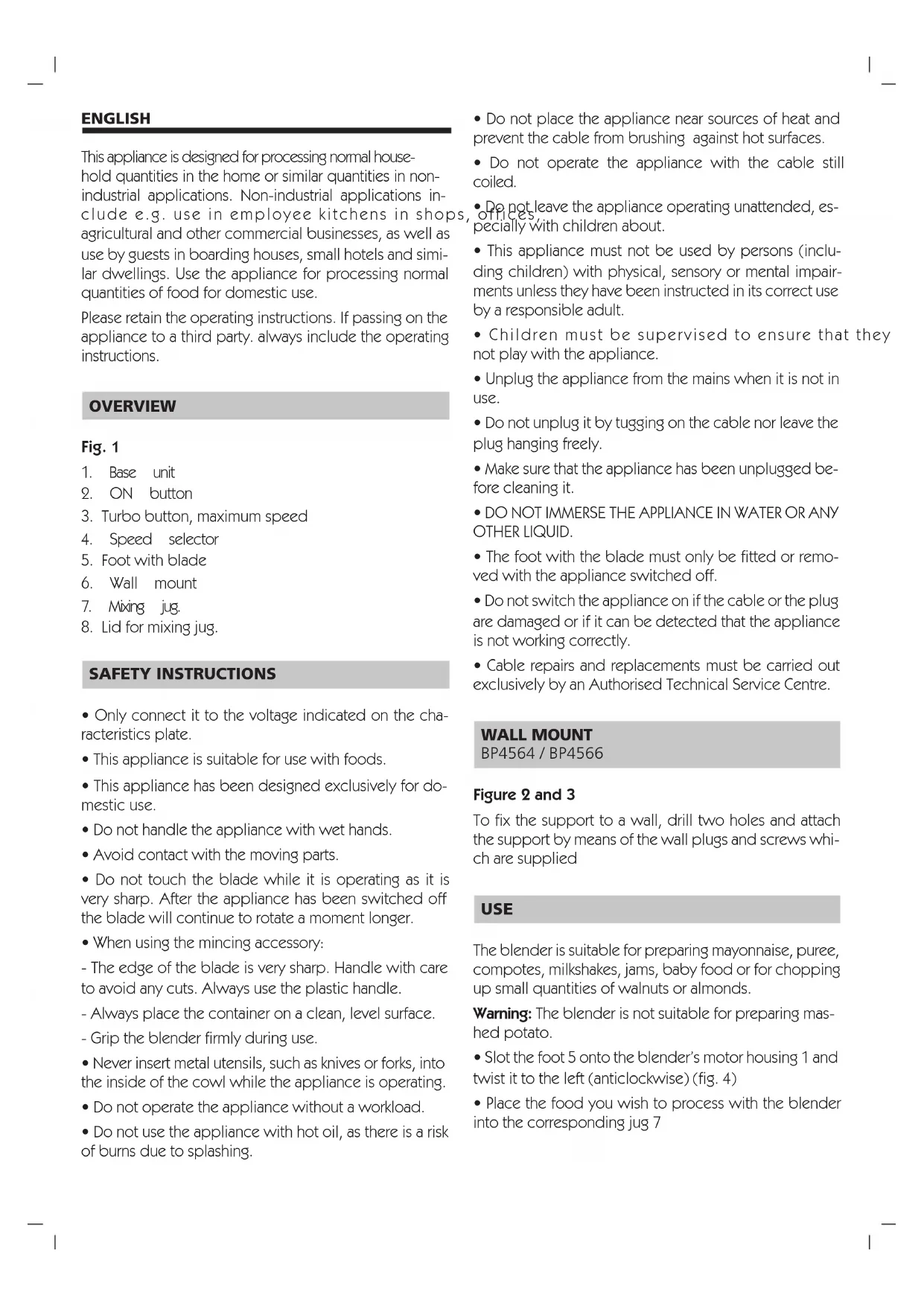 - Cable repairs and replacements must be carried out exclusively by an Authorised Technical Service Centre. WALL MOUNT BP4564 / BP4566 Figure 2 and 3 To fix the support to a wall, drill two holes and attach the support by means of the wall plugs and screws whi- ch are supplied USE The blender is suitable for preparing mayonnaise, puree, compotes, milkshakes, jams, baby food or for chopping up small quantities of walnuts or almonds.