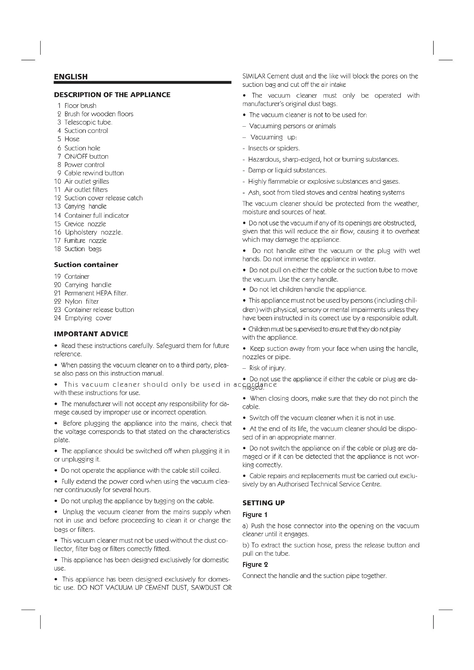1 Floor brush 2 Brush for wooden floors 3 Telescopic tube. 4 Suction control 5 Hose 6 Suction hole 7 ON/OFF button 8 Power control 9 Cable rewind button 10 Air outlet grilles 11 Air outlet filters 12 Suction cover release catch 13 Carrying handle 14 Container full indicator 15 Crevice nozzle 16 Upholstery nozzle. 17 Furniture nozzle 18 Suction bags Suction container 19 Container 20 Carrying handle 21 Permanent HEPA filter. 22 Nylon filter 23 Container release button 24 Emptying cover IMPORTANT ADVICE