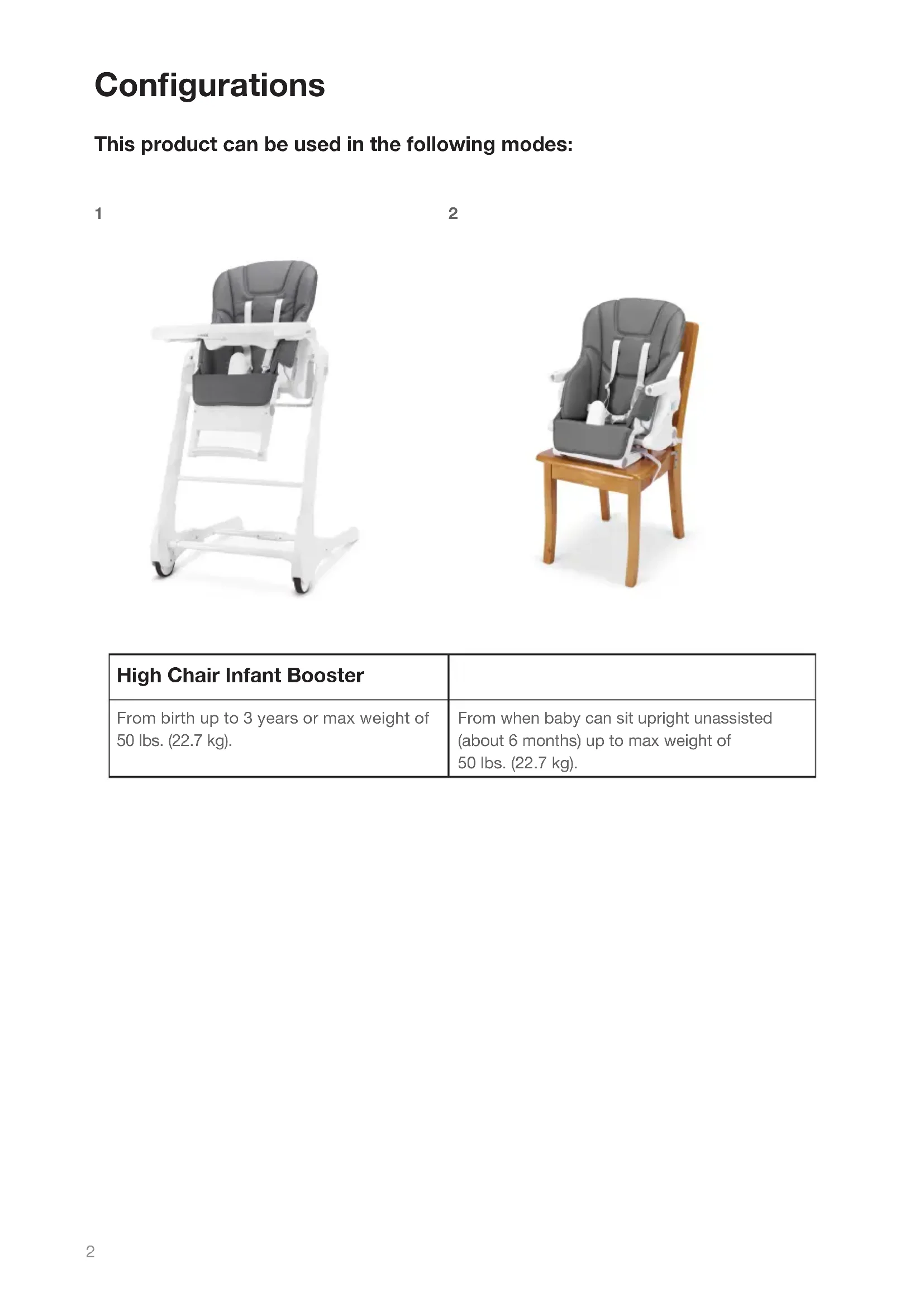High Chair Infant Booster From birth up to 3 years or max weight of 50 lbs. (22.7 kg). From when baby can sit upright unassisted (about 6 months) up to max weight of 50 lbs. (22.7 kg).3 High Chair Mode (No. 1) FALL HAZARD: Children have suered severe head injuries including skull fractures when falling from high chairs. Falls can happen suddenly if child is not restrained properly.