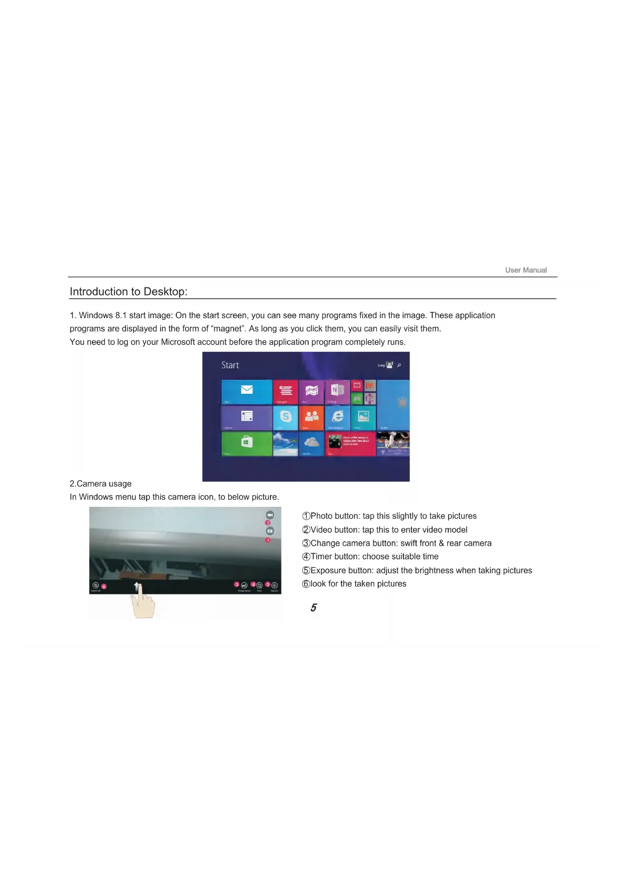 programs are displayed in the form of “magnet”. As long as you click them, you can easily visit them. You need to log on your Microsoft account before the application program completely runs. 2.Camera usage In Windows menu tap this camera icon, to below picture. 1 Photo button: tap this slightly to take pictures 2 Video button: tap this to enter video model 3 Change camera button: swift front & rear camera 4 Timer button: choose suitable time 5 Exposure button: adjust the brightness when taking pictures 6 look for the taken pictures3. Image slide applications Slide to right:Slide to the right from the left side of the screen to start the application program in running. Slide to left: Slide to the left from the right side of the screen to start Charm menu column. Reduce:On the touch screen, narrow two fingers to reduce the image. Enlarge: On the touch screen, widen two fingers to enlarge the image.Slide downward :In start screen, slide from the top of the screen to view all application programs. Slide with finger :In start screen, slide finger right and left to move the image. Slide upward: In the start screen, slide upward from the bottom of the screen to visit all application program (APPS) interfaces.4.Introduction to app Interface Besides the application programs already fixed on the start screen, you can also start other application programs in all application programs, such as other software application programs attached to the Tablet PC. If you want to fix more application programs on the start interface, see the operation in the figure below, (1) lightly touch, press and hold the application program magnet for about one second and then let go, and select (2) to fix to the start screen.Conversely, if you want to cancel or delete a certain application in the start screen, (1) lightly touch, press and hold the application program magnet for about one second and then let it go and run, and select (2) attribute column to cancel the programs such as fixation and deletion and then it can be completed.5. Charm menu column Slide it to the left from the right side of the screen to start Charm menu column, including: Start, Device, Setup, Share, and Search Program. Can let you search the files and application programs in the Tablet PC. Can let you share the program through social exchange website or e-mail. Can return to the start screen. From the start screen, you can also use this function to return the application program that is opened in the latest. Can let you read, write and share files, connect external screen or printer with the device connected to the Tablet PC. Can let you set up the Table PC. Search menu Share menu Device Menu Set up Menu Slide it to the left from the right side of the screen to start Charm menu column, including: Start, Device, Setup, Share, and Search Program.6.Dual-Screen Application On my computer in (Figure 1), slide it inward from the left side of the screen, drag it and hold. Let go when seeing double interfaces appear. In (Figure 2), press the partition button on the middle partition line and drag right and left to partition the display proportion of the double screens. (Figure 1) (Figure 2) 7.Exit the apps In apps or settings screen , Slide downward to exit the app, to below picture.Basic Operations: