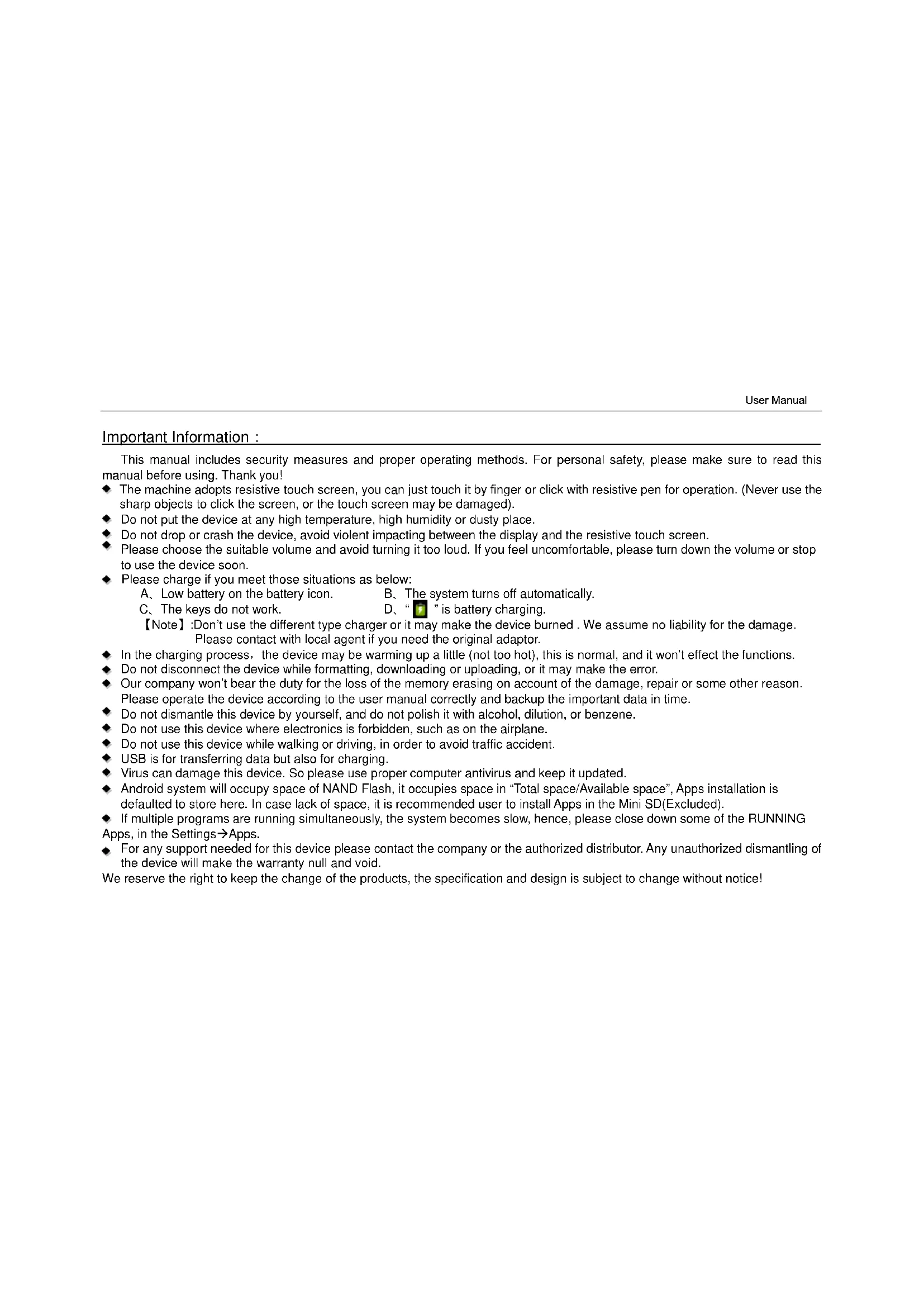 This device adopts built-in polymer battery. Only the specified charger should be used.