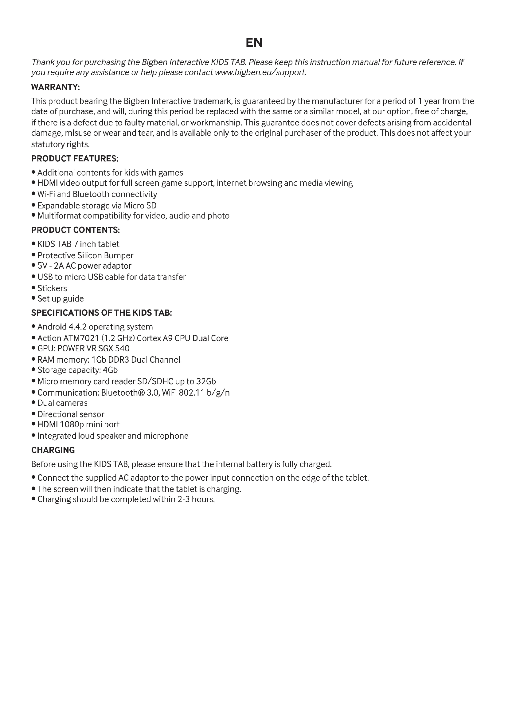 Thank you for purchasing the Bigben Interactive KIDS TAB. Please keep this instruction manual for future reference. If you require any assistance or help please contact www.bigben.eu/support.