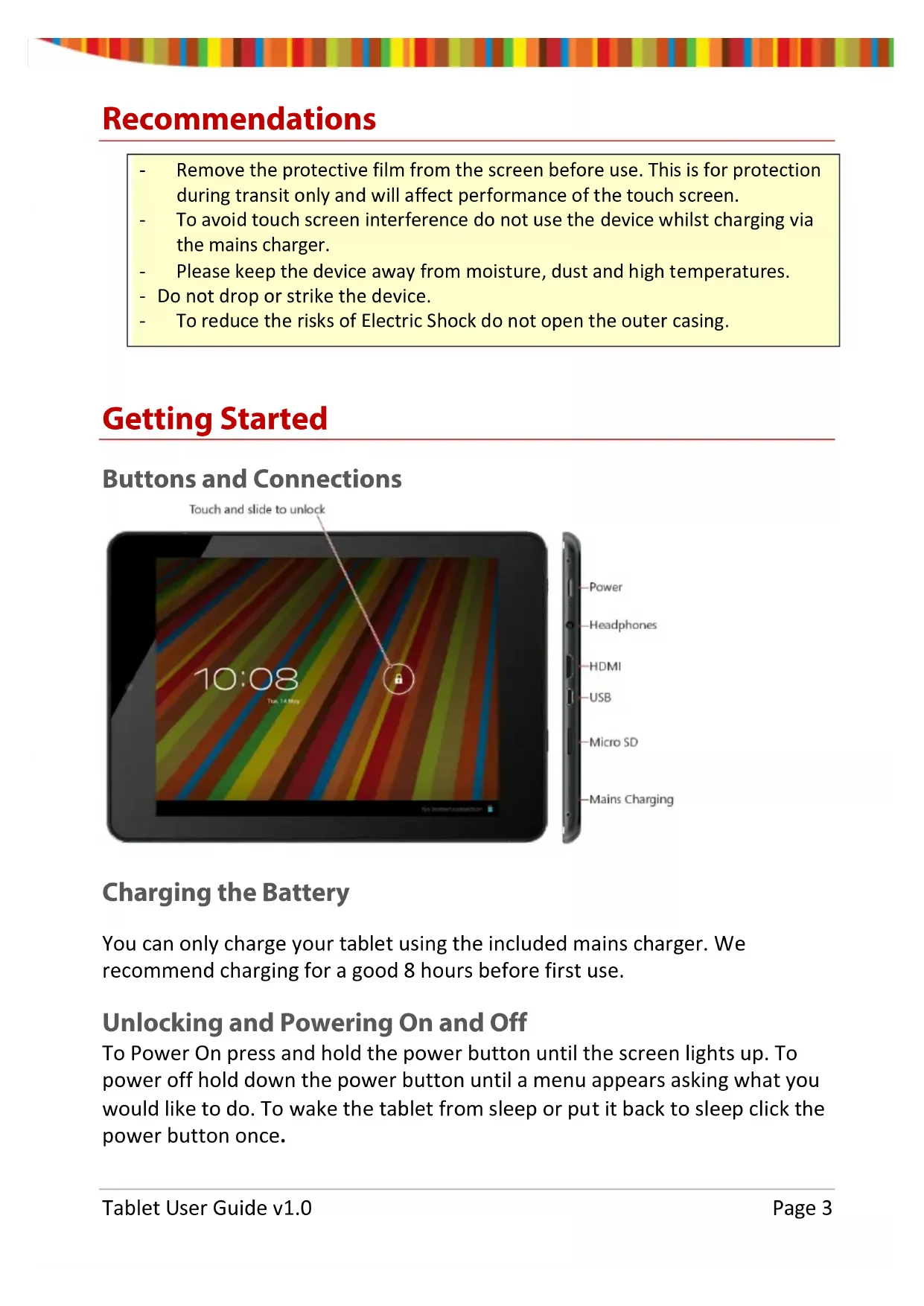 area or to return to the home screen press the home icon. Tablet User Guide v1.0 Page 17Troubleshooting Resetting your device to Factory Defaults If you need to reset your device to the factory default settings for any reason please follow the process below: WARNING!!! Please be aware any information currently on the device will be permanently erased by following this procedure.