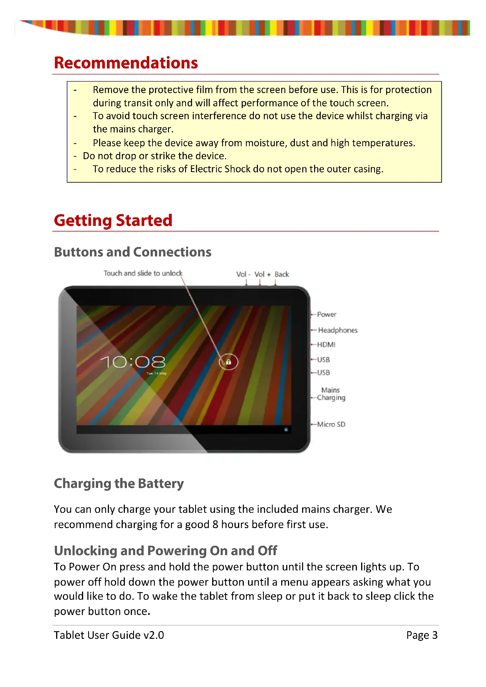 area or to return to the home screen press the home icon. Tablet User Guide v2.0 Page 17Troubleshooting Resetting your device to Factory Defaults If you need to reset your device to the factory default settings for any reason please follow the process below: WARNING!!! Please be aware any information currently on the device will be permanently erased by following this procedure.