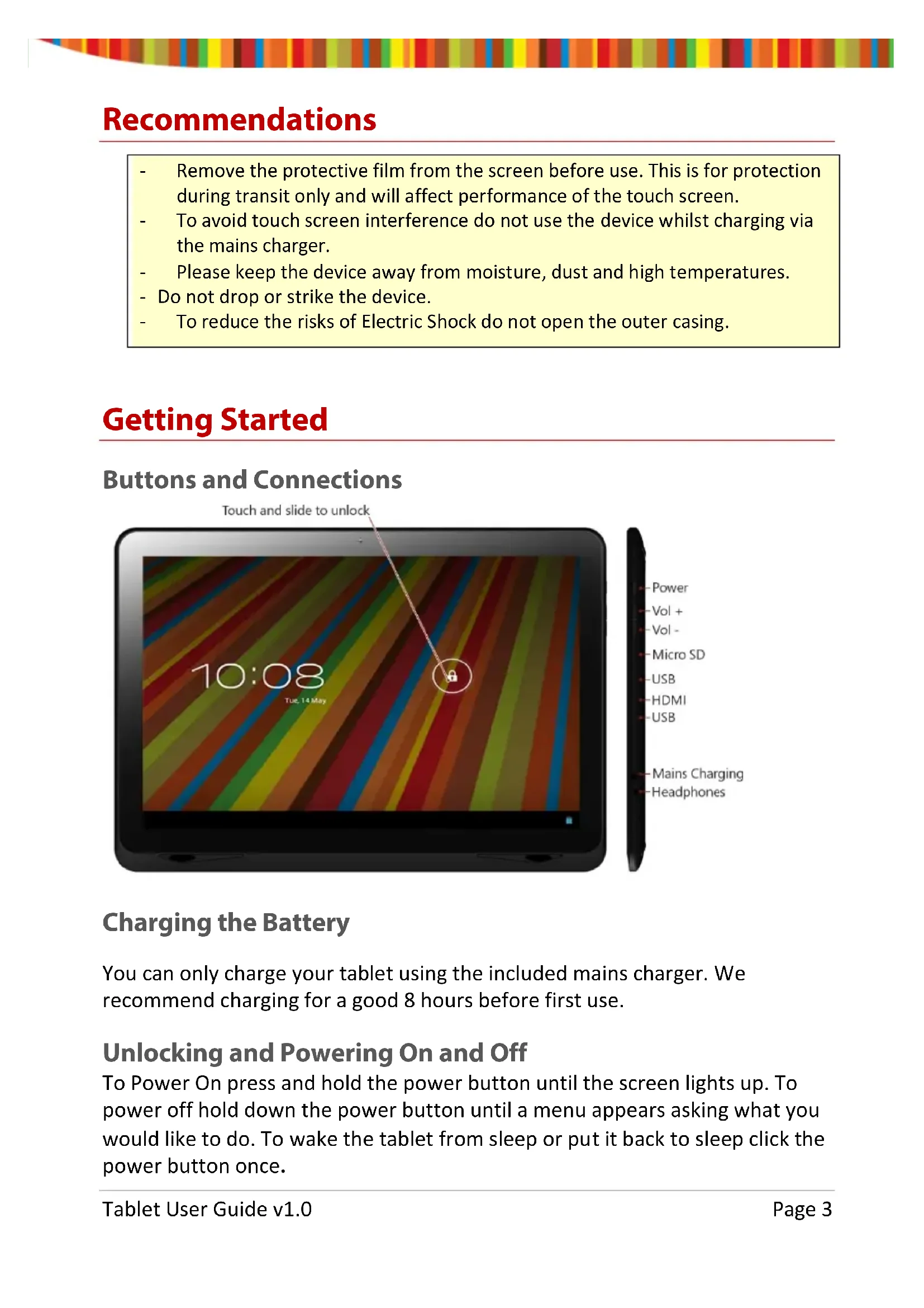 - Change input language or keyboard: Touch & hold the key to the left of the space bar (with ... in the lower-right corner), and then release it. The Input options menu appears. Choose the option you want to adjust. Tablet User Guide v1.0 Page 9Settings The settings screen can be accessed by touching the settings icon under applications or on the status bar at the bottom right of the home screen. These options allow you to configure your device to your requirements. The following options are available: Please note that you can get to application specific settings by touching the settings icon in the status bar whilst you are in an application.