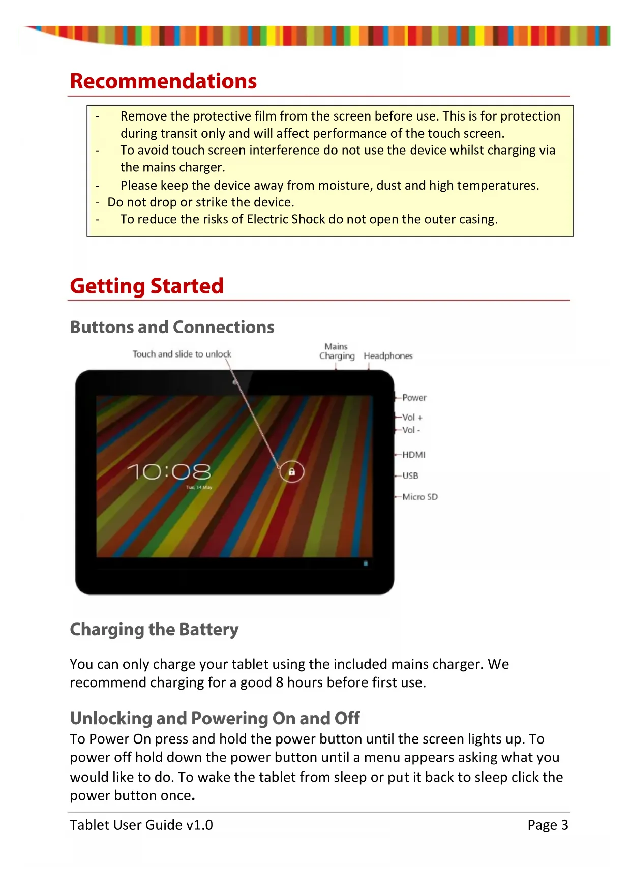 - Change input language or keyboard: Touch & hold the key to the left of the space bar (with ... in the lower-right corner), and then release it. The Input options menu appears. Choose the option you want to adjust. Tablet User Guide v1.0 Page 9Settings The settings screen can be accessed by touching the settings icon under applications or on the status bar at the bottom right of the home screen. These options allow you to configure your device to your requirements. The following options are available: Please note that you can get to application specific settings by touching the settings icon in the status bar whilst you are in an application.